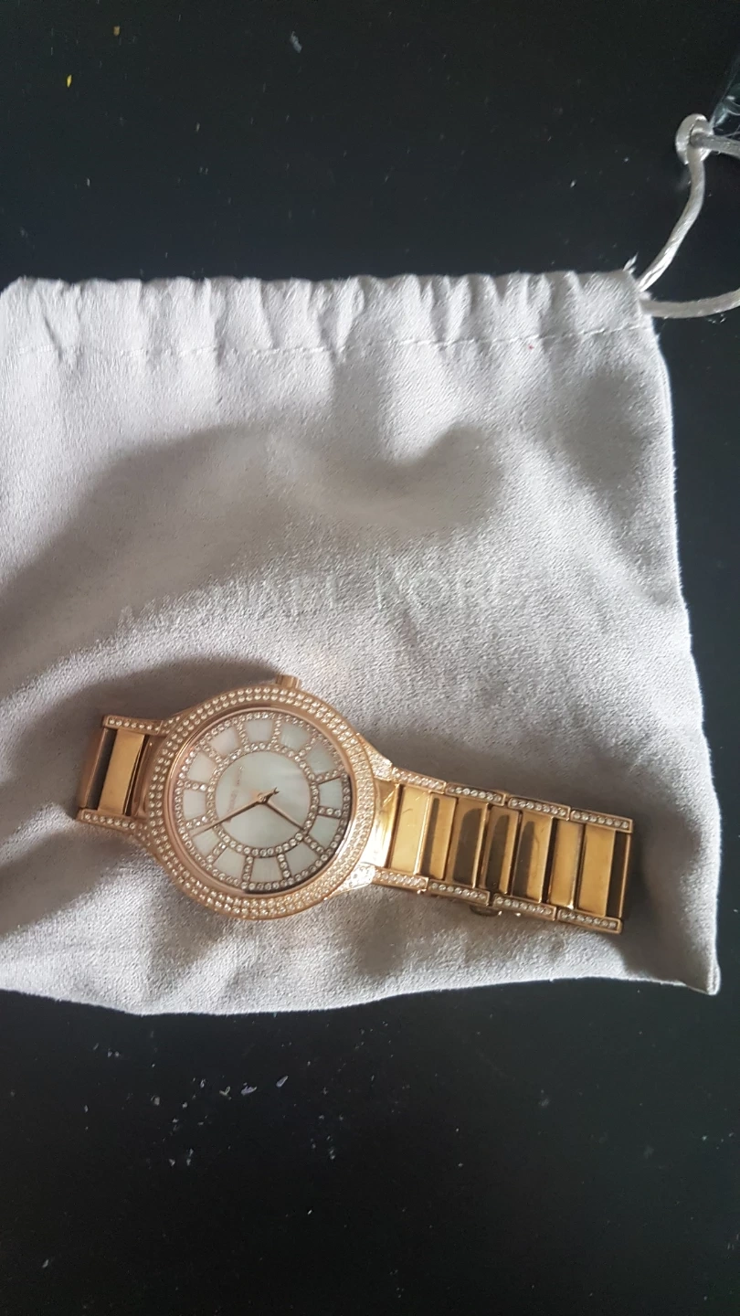 Beautiful rose gold Michael Kors watch with crystal accents on the bezel and band. Features a mother-of-pearl dial. It's a statement piece that adds sparkle to any outfit! This watch comes with a soft protective pouch, does need a new