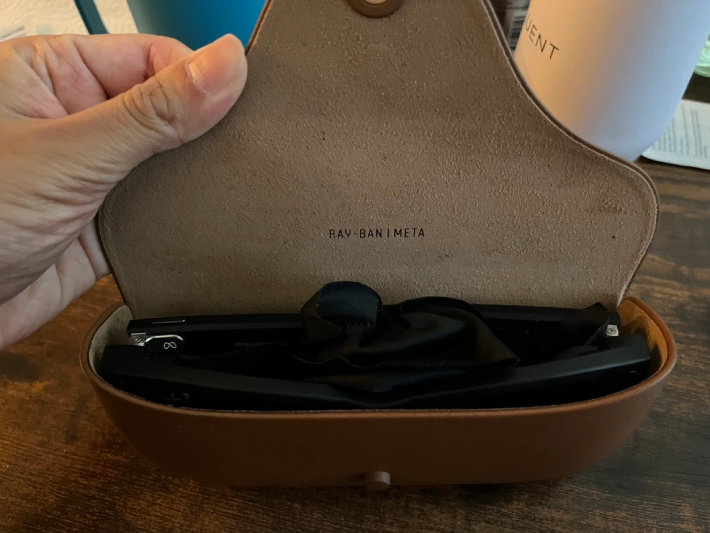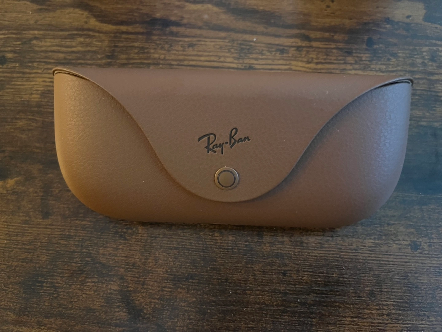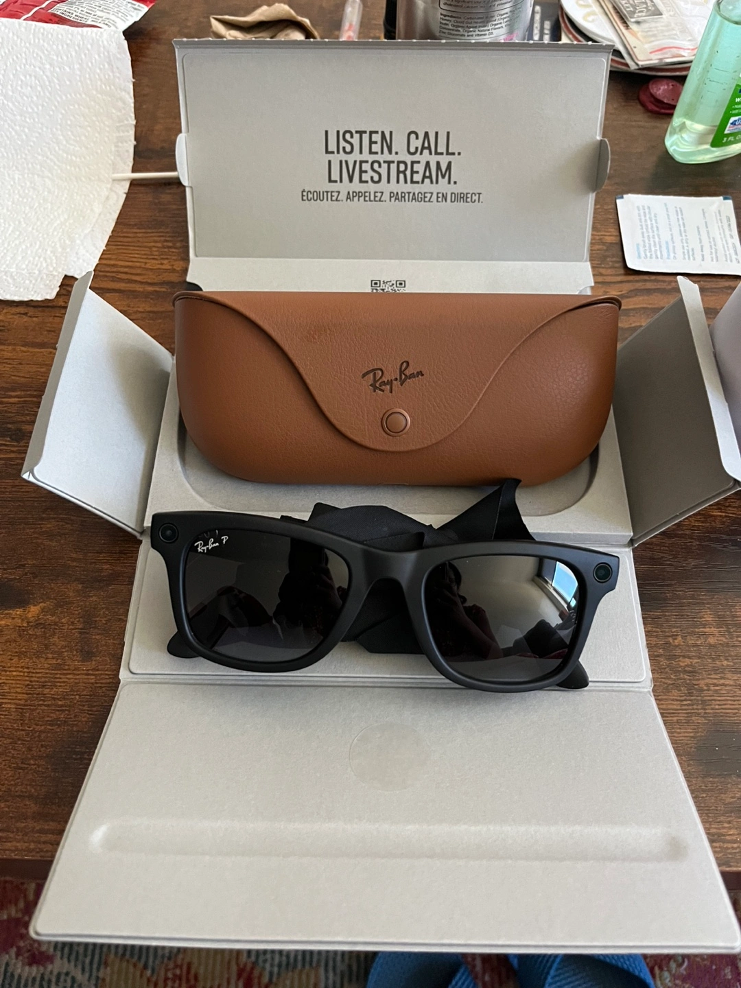 Smart glasses with polarized frames. Powered by Meta AI, can take pictures and connects to an App. Matte black rayban wayfarer frames. Charges inside the case, case charged with USB-C.