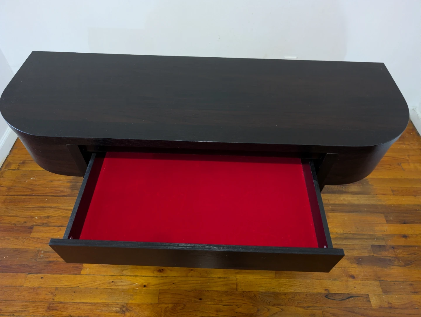 THE BEST PART: Open the center drawer and you'll find a gorgeous RED VELVET LINING. Perfect for protecting your keys, jewelry, or delicate items. It's like having a hidden jewelry box!