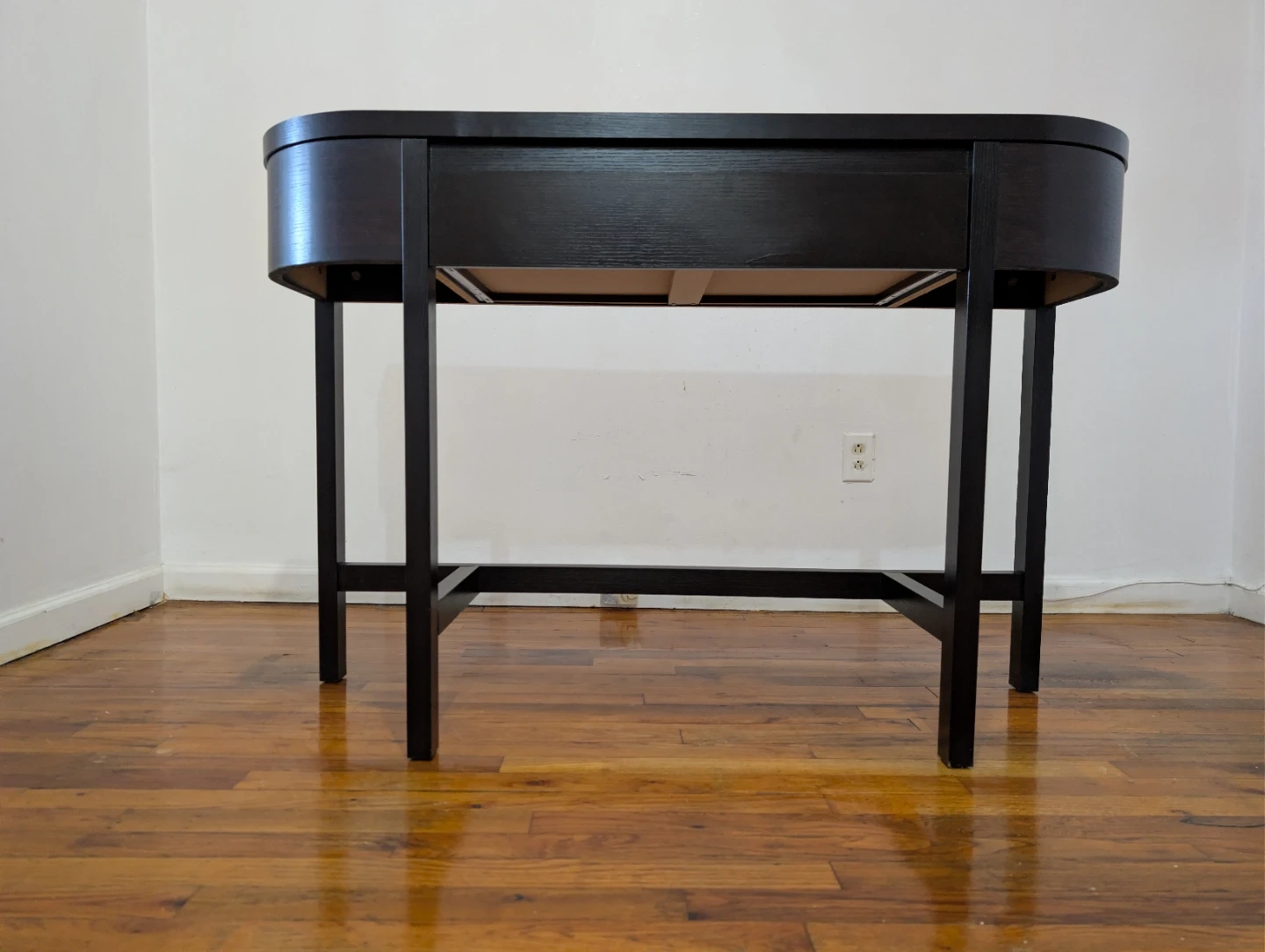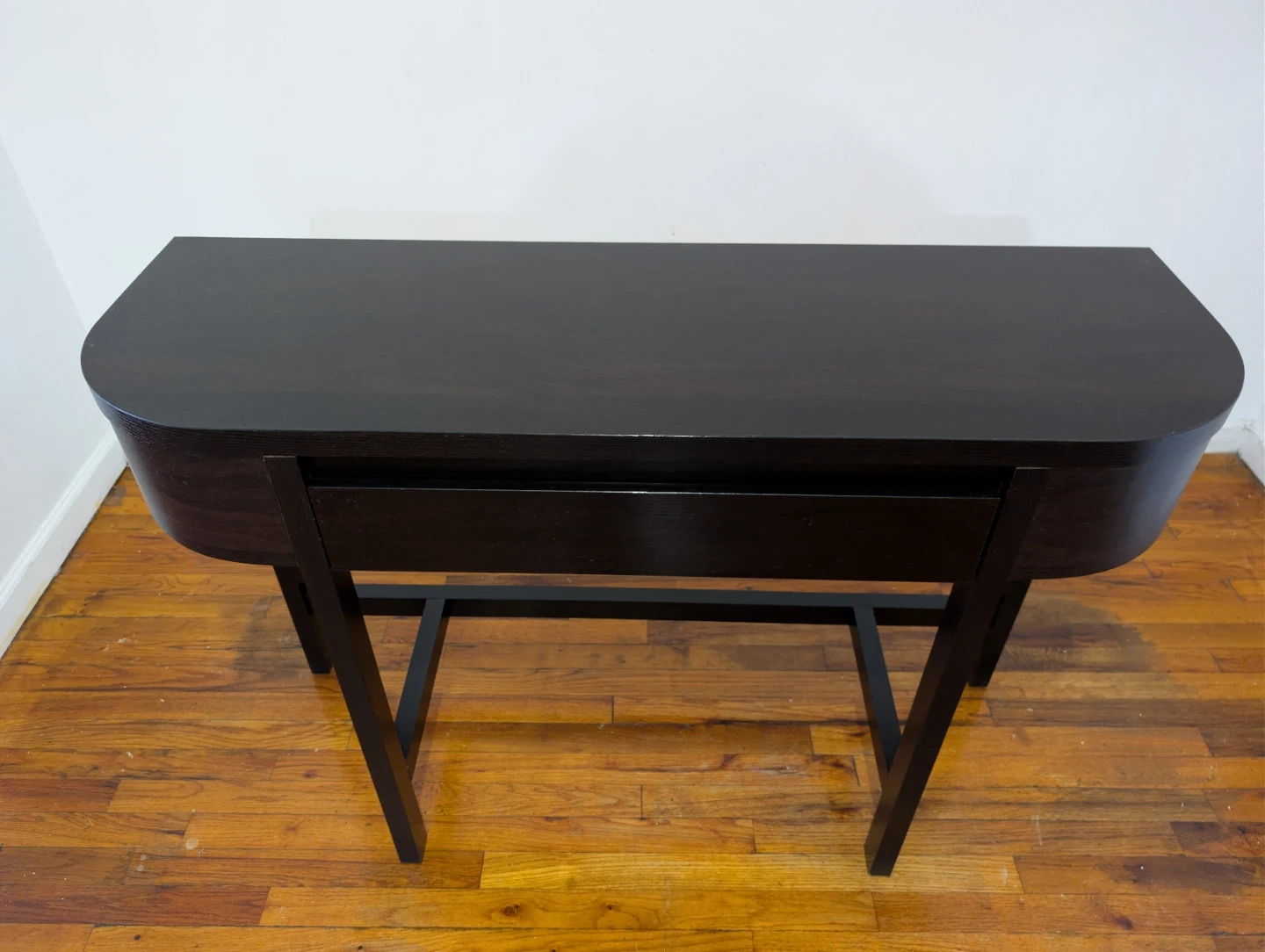 Sleek and elegant console table for sale in perfect condition. It has a beautiful dark wood finish and curved sides that fit any modern decor. Perfect for smaller spaces, entryways, or as a hallway accent.