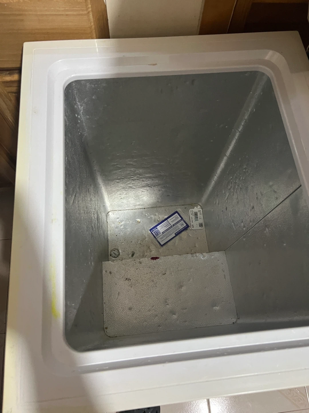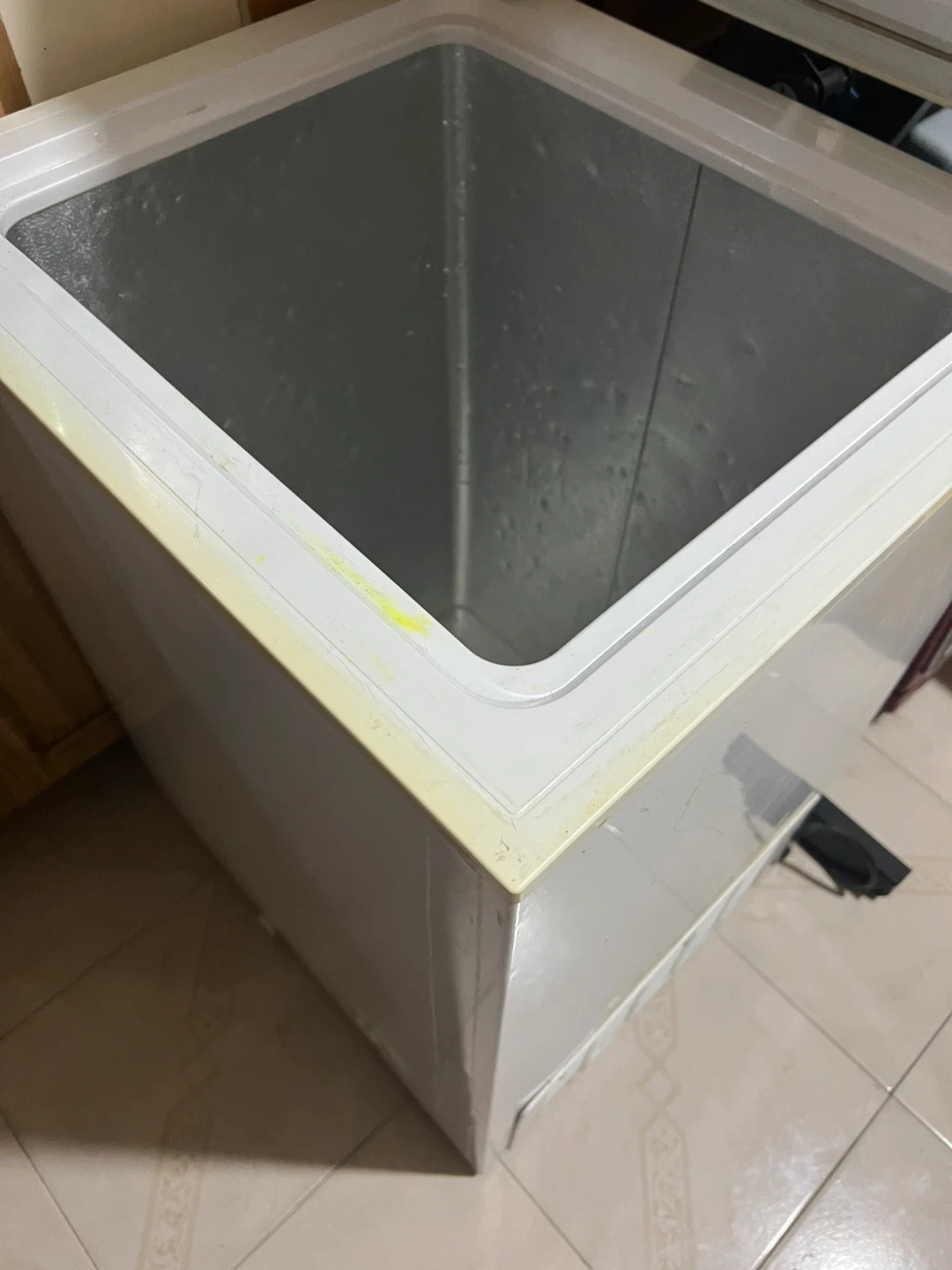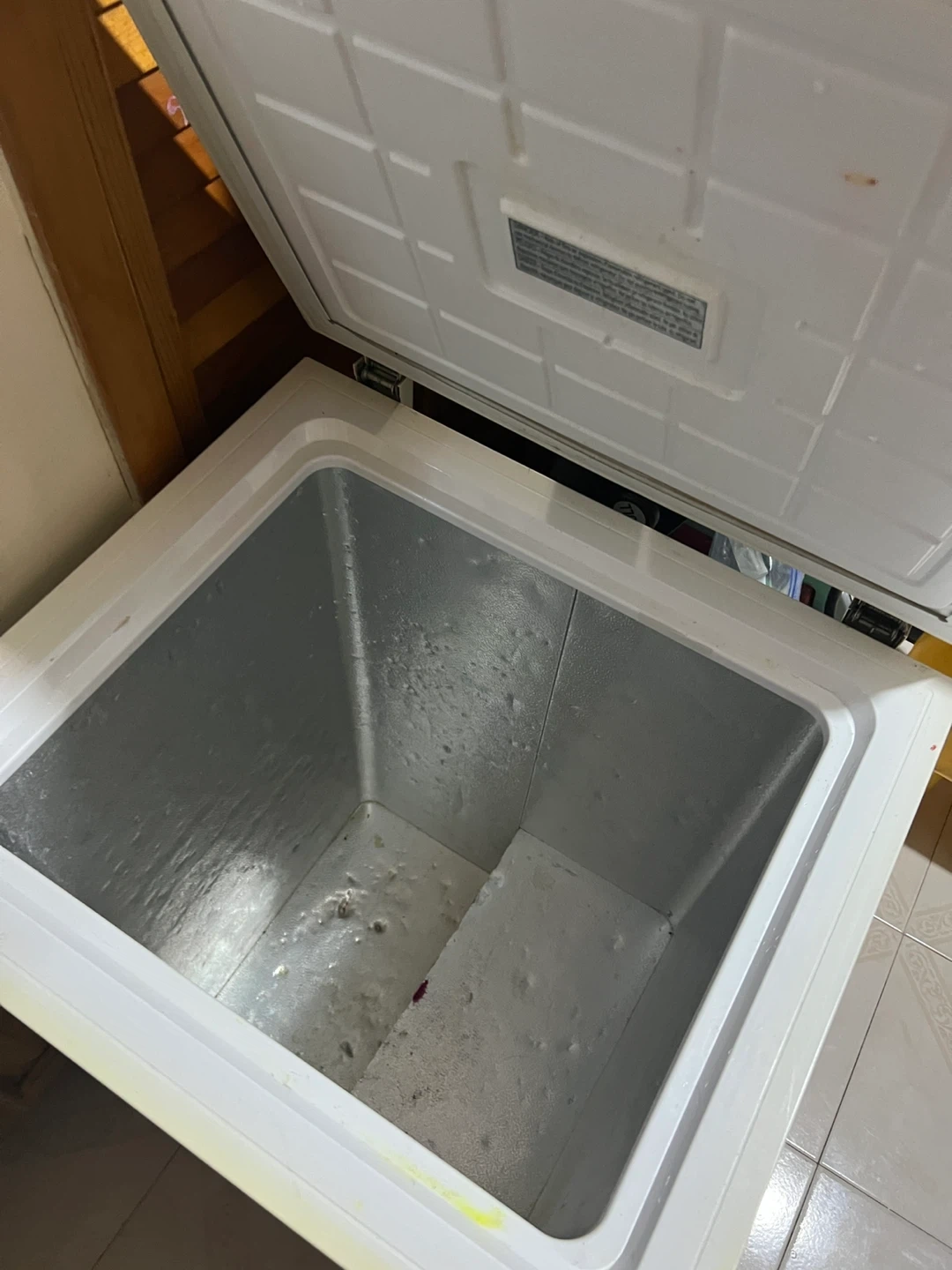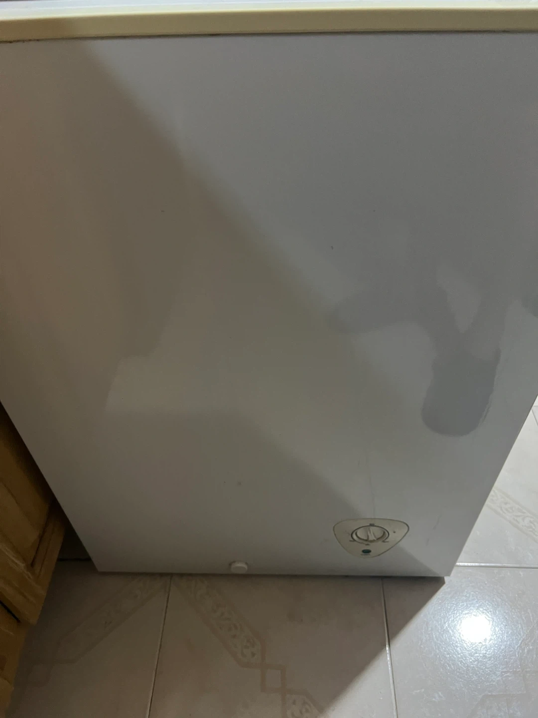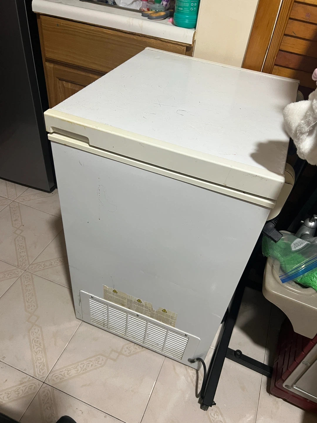This is a white chest freezer. It has a temperature control dial on the front. The interior has a removable shelf.