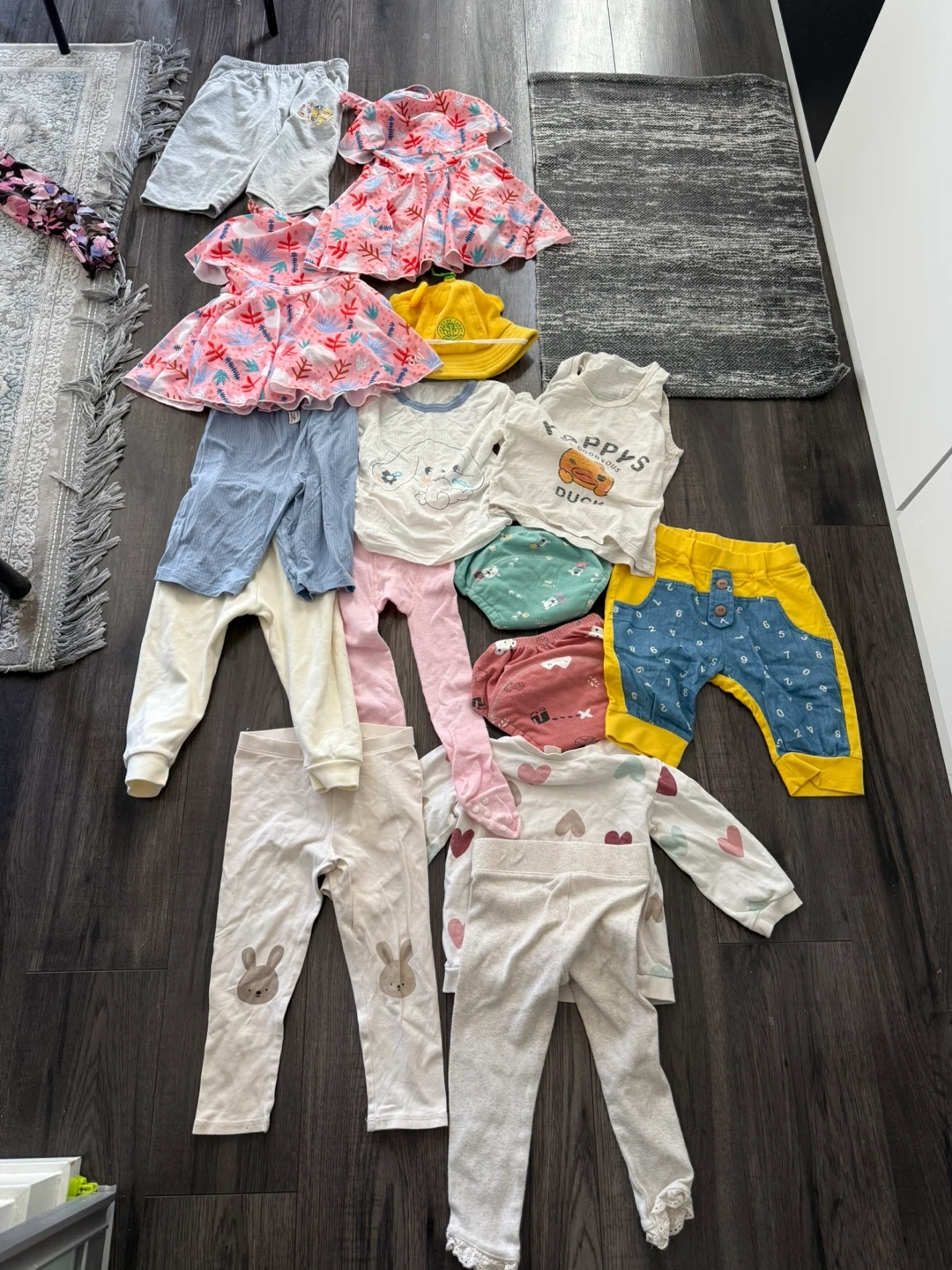 This bundle includes several cute pieces of baby clothing. Items feature various patterns like hearts, bunnies, and a duck graphic. Includes dresses, pants, and tops made from soft fabrics.