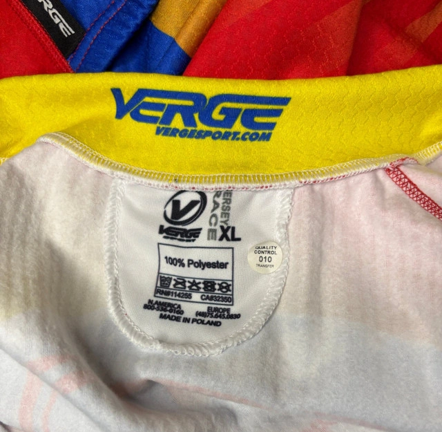 Stay ahead of the peloton with the Verge Sport Pikes Peak Velo Cycling Race Long Sleeve Jersey. Designed for cooler rides, this jersey offers superior moisture wicking and thermal properties to keep you warm and dry. Its polyester performance fabric has a soft liner for added warmth. The ergonomic and aerodynamic tight fit ensures peak performance while the full zip closure provides ventilation when you need it most. The vibrant Pikes Peak Velo graphics add a bold, stylish touch, making this jersey perfect for training or racing in style. Built for serious to recreational cyclists who require function along with a great look. This is a brand new with quality control sticker still attached Verge Sport Pikes Peak Velo Cycling Race Long Sleeve Jersey measuring as a size adult XL. For sizing specifics, please see the attached measurement guide included with the pictures in our listing. Local pickup is in Etobicoke near Islington and The Westway.