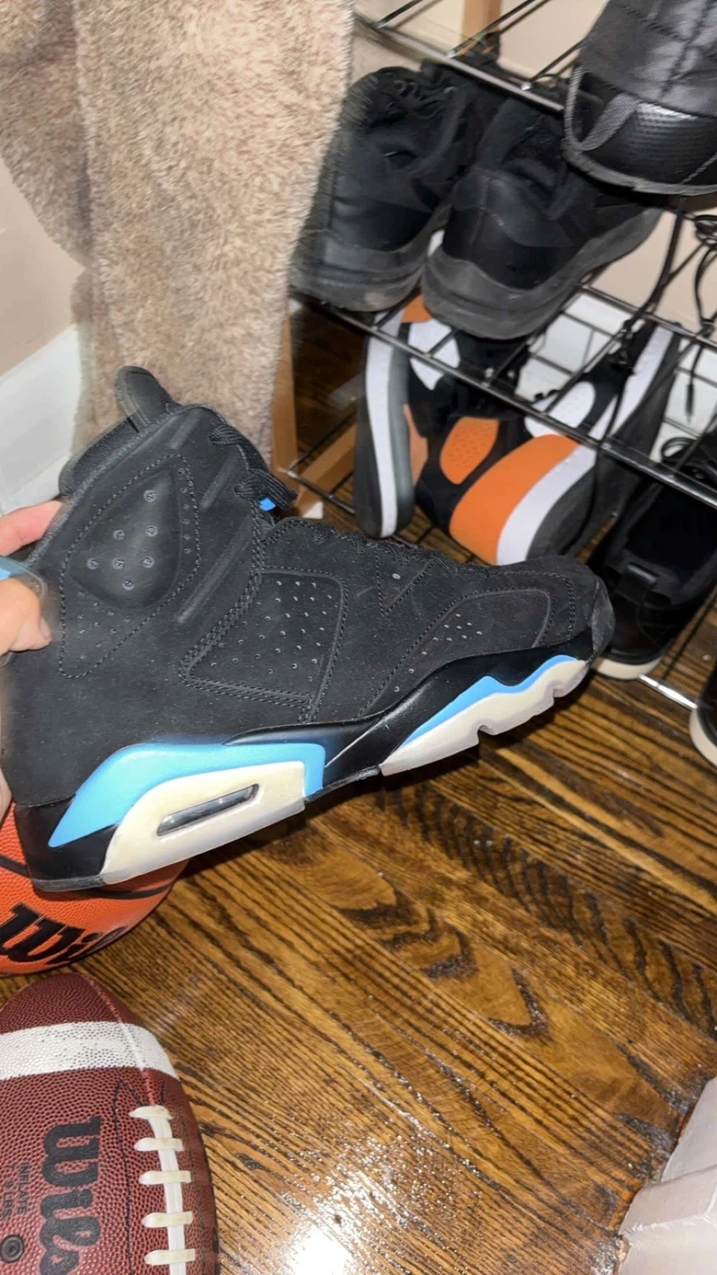 Classic black Air Jordan 6 Retro sneakers with university blue accents. These feature a durable suede and leather upper with the iconic lace lock. The visible Air unit in the heel provides cushioning. Great for sneaker collectors or everyday wear!