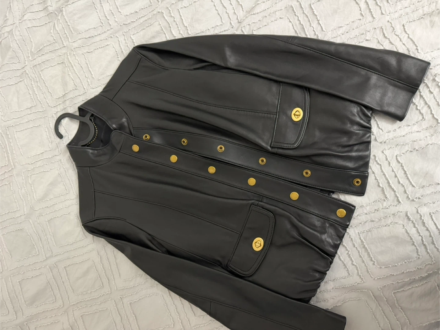 A stylish black leather jacket from Coach. It features gold hardware and multiple pockets. This jacket's classic design makes it a versatile addition to any wardrobe!