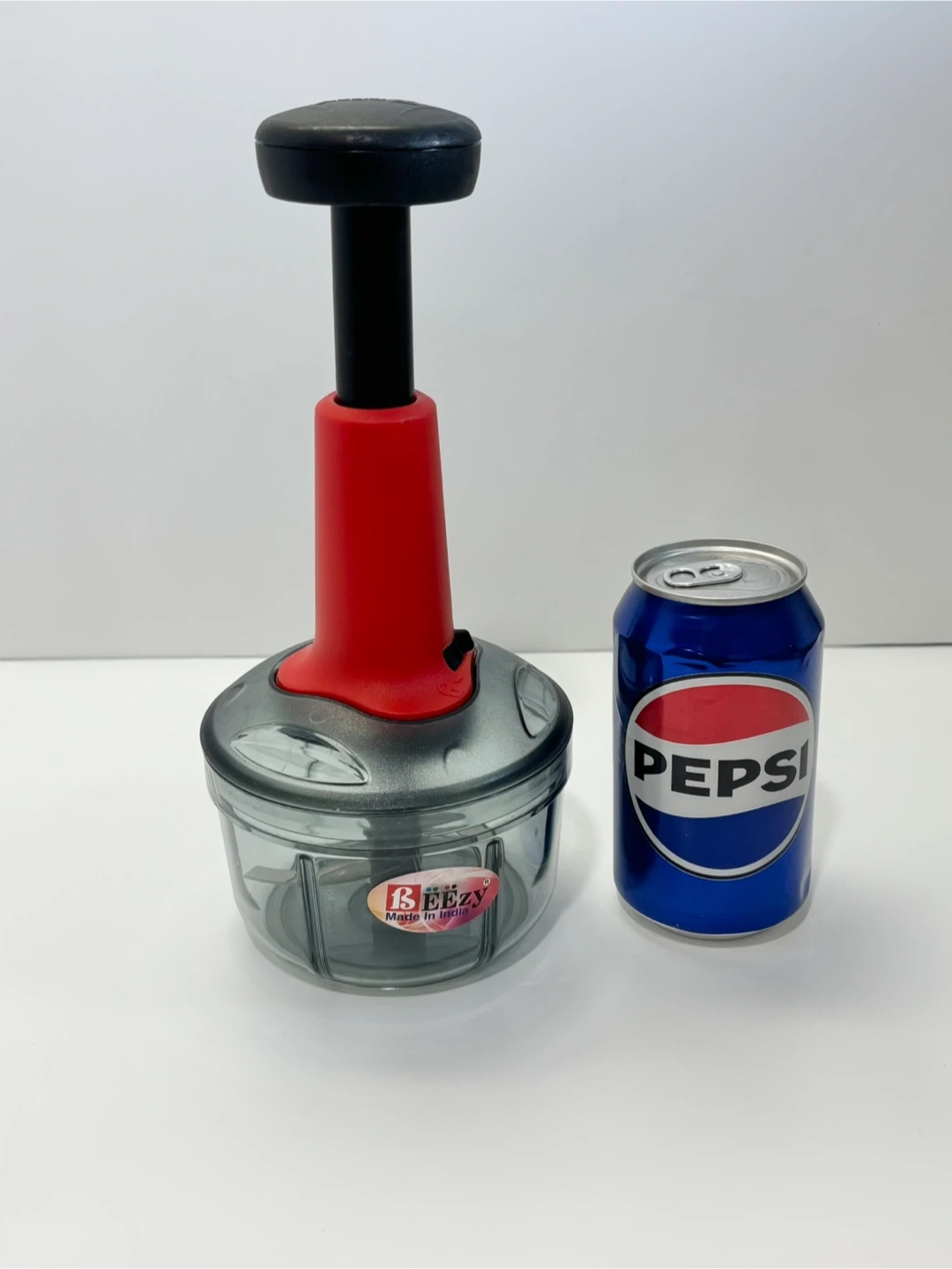 This is a BEEZY manual food chopper. It has a clear plastic base and a red and black plunger mechanism. Dishwasher safe.