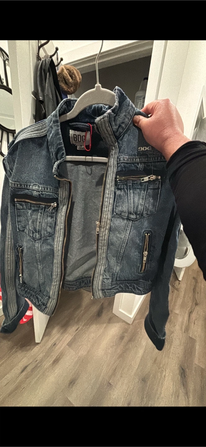 Selling a BDG denim jacket in size medium. It has a cool, slightly distressed look with zipper details on the pockets. Great for layering! Only worn twice.