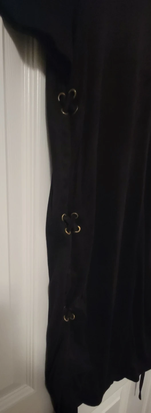 This black t-shirt dress has a unique design with ruched detailing and lacing on the sides. It features short sleeves and a keyhole detail at the back neckline. Made from a soft, comfortable fabric.