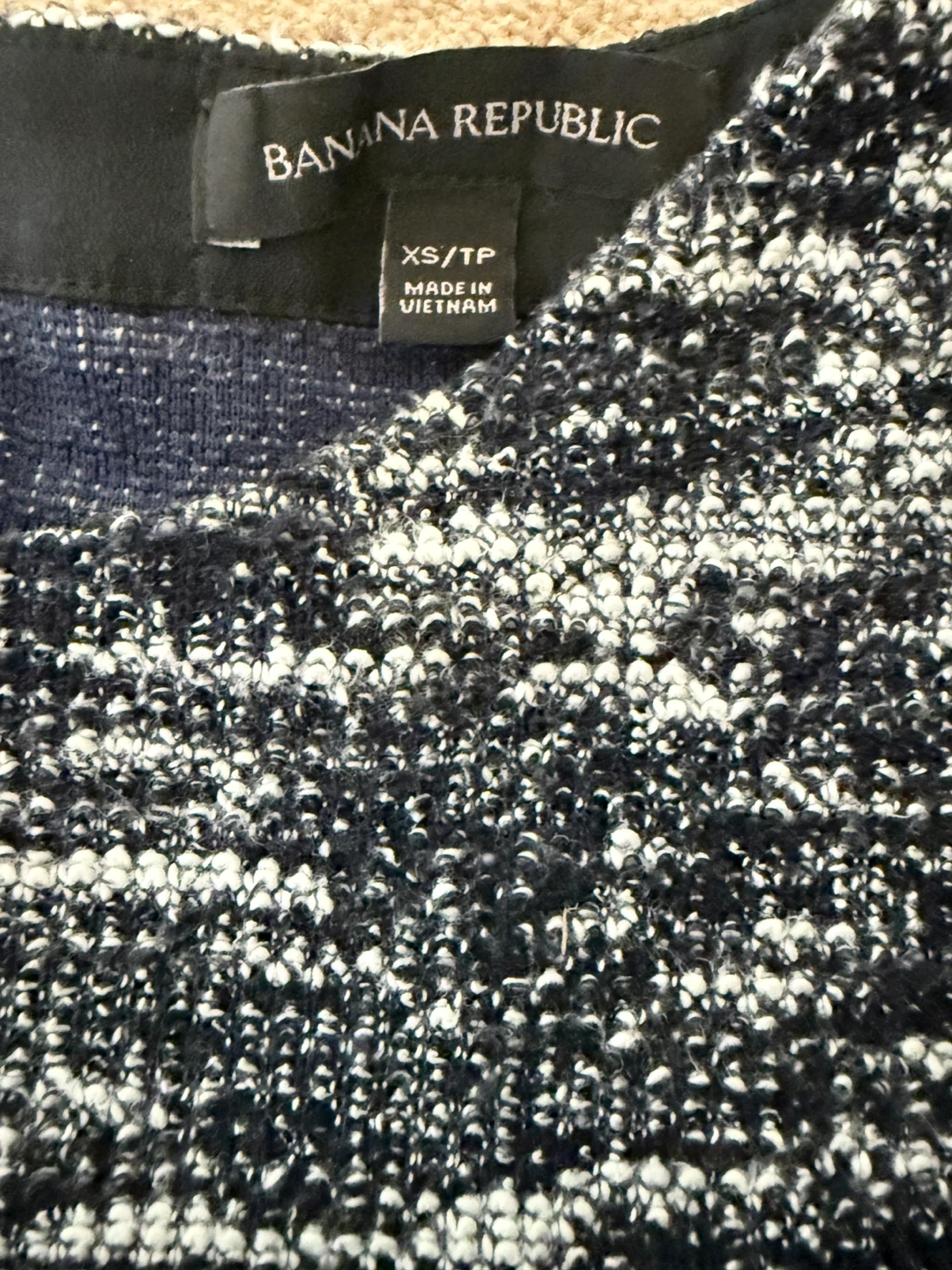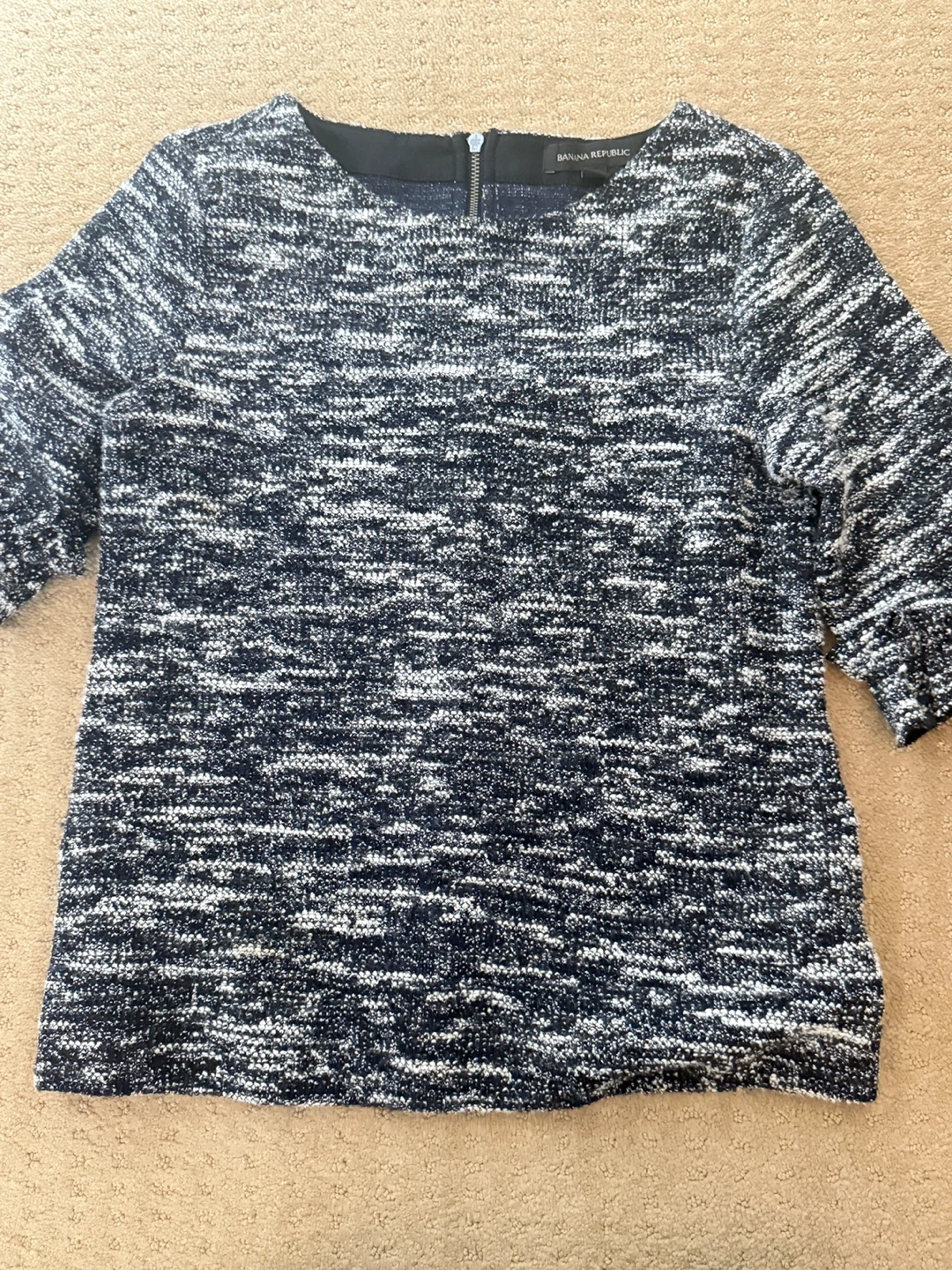 This Banana Republic knit top features a textured pattern in black, white, and navy. It has a zipper closure at the back. Size is XS/TP.