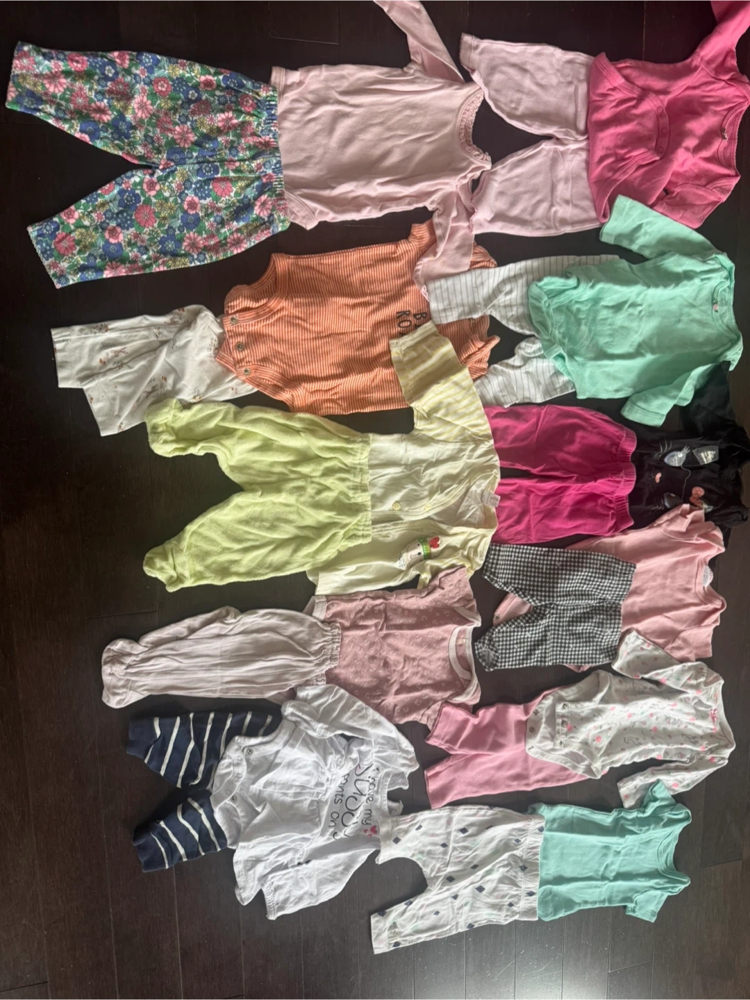 A collection of various baby clothes including onesies and pants. Many pieces are in soft pastel colours like pink, yellow, and mint green, with some floral and striped patterns. It's a mix of short and long sleeves, perfect for everyday wear.