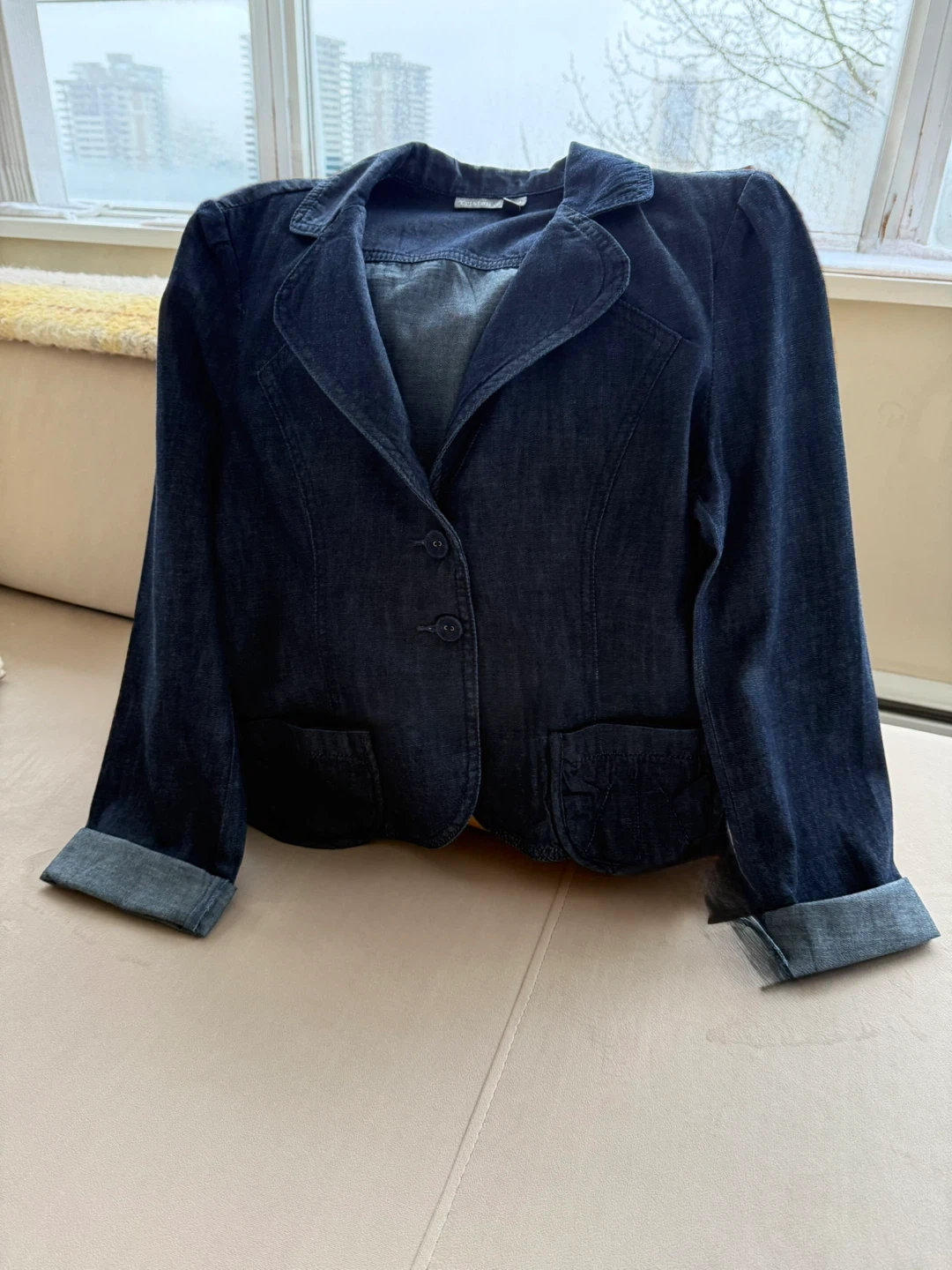 A stylish Tristan & Isolde denim blazer. Features a notched collar and button-up front. A nice layering piece for your wardrobe! This is a softer and a lighter jean material.