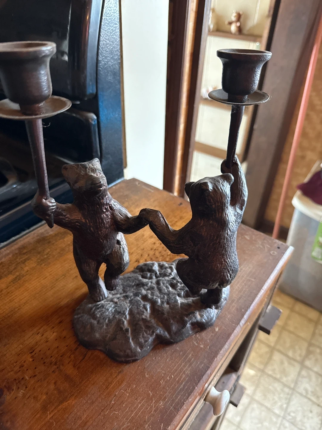 This is a charming candle holder featuring two bears holding hands. It's a unique piece that would add character to any room!