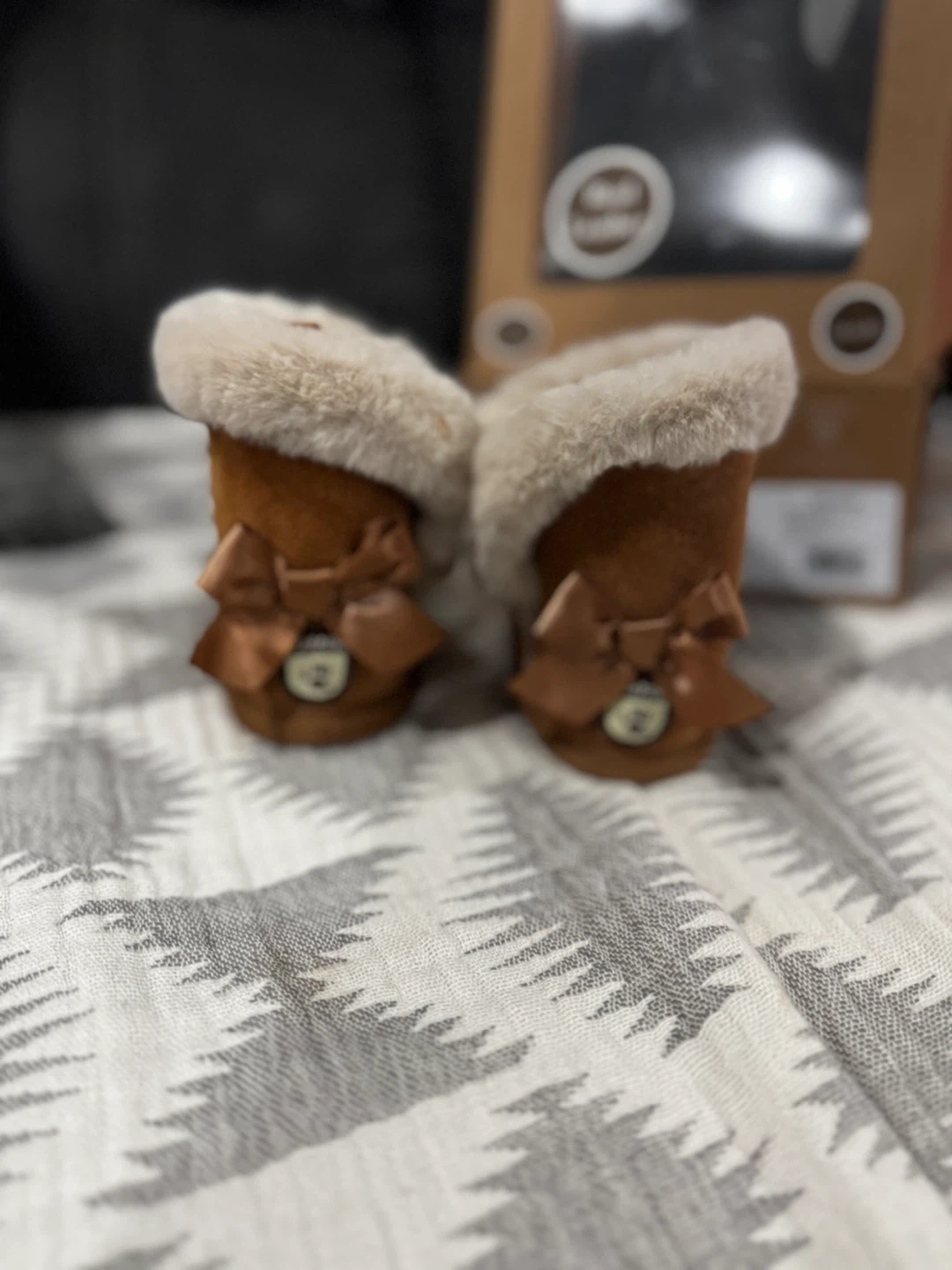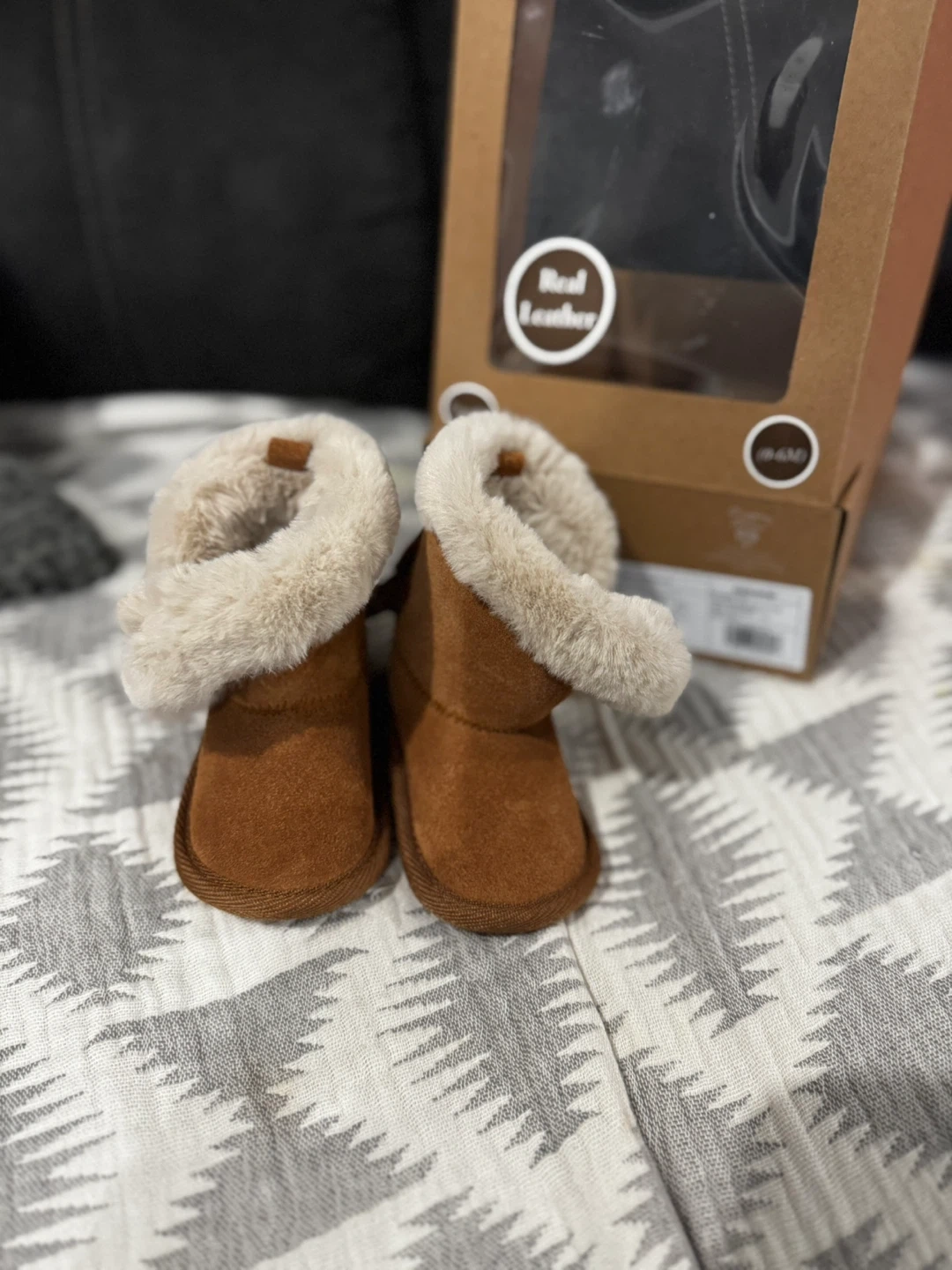 These adorable Bearpaw infant boots are in excellent condition and come with the original box! They are made of real leather with a faux fur trim, perfect for keeping your little one's feet warm and cozy. Size is 0-6 months.