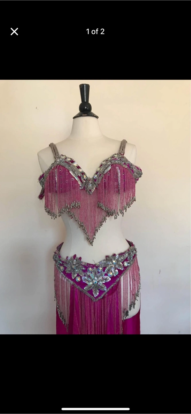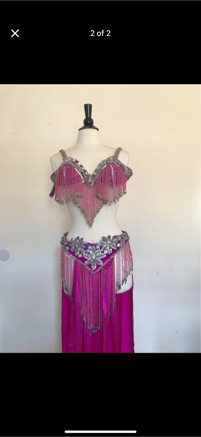 Gorgeous two-piece belly dance costume. Pink fabric, silver embellishments, and fringe. Includes a bra top and a belt. Ready for your next performance!