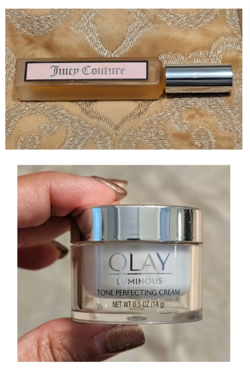 Get two great luxury and skincare items in one convenient set! Items Included: Juicy Couture Rollerball Fragrance: Perfect for travel or your purse! A lovely, amber-colored scent from the popular Juicy Couture line. Rollerballs are great for easy application. Olay Luminous Tone Perfecting Cream (0.5 oz / 14 g): A travel or trial size of Olay's popular moisturizer designed to hydrate and even out skin tone. Perfect for testing out the product or for a trip! Directions on the back state: "Smooth evenly over your entire cleansed face and neck morning and night." Condition: The fragrance bottle is full. The Olay cream jar is a brand new, travel-sized (0.5 oz) jar. Why Buy This Bundle? Great Value: Save money on two popular beauty items. Travel-Friendly: Both items are the perfect size for carrying on the go or taking on vacation. Treat Yourself: A touch of luxury with the perfume and a quality skincare product!