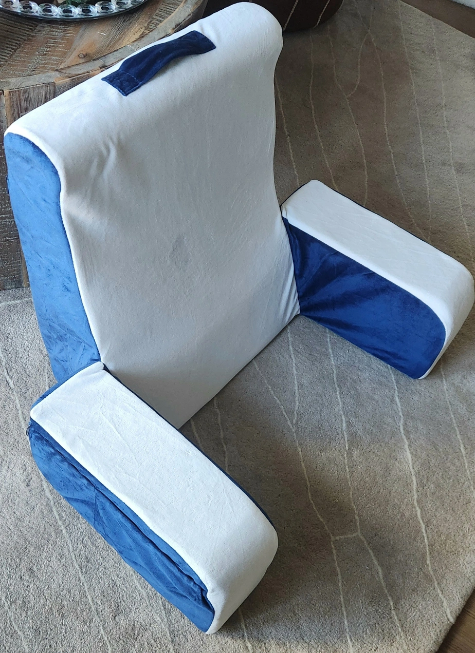 This is a bed rest pillow, perfect for reading or watching TV in bed! The pillow is in great condition and has a handle for easy carrying. It's a cozy addition to any bedroom or living space