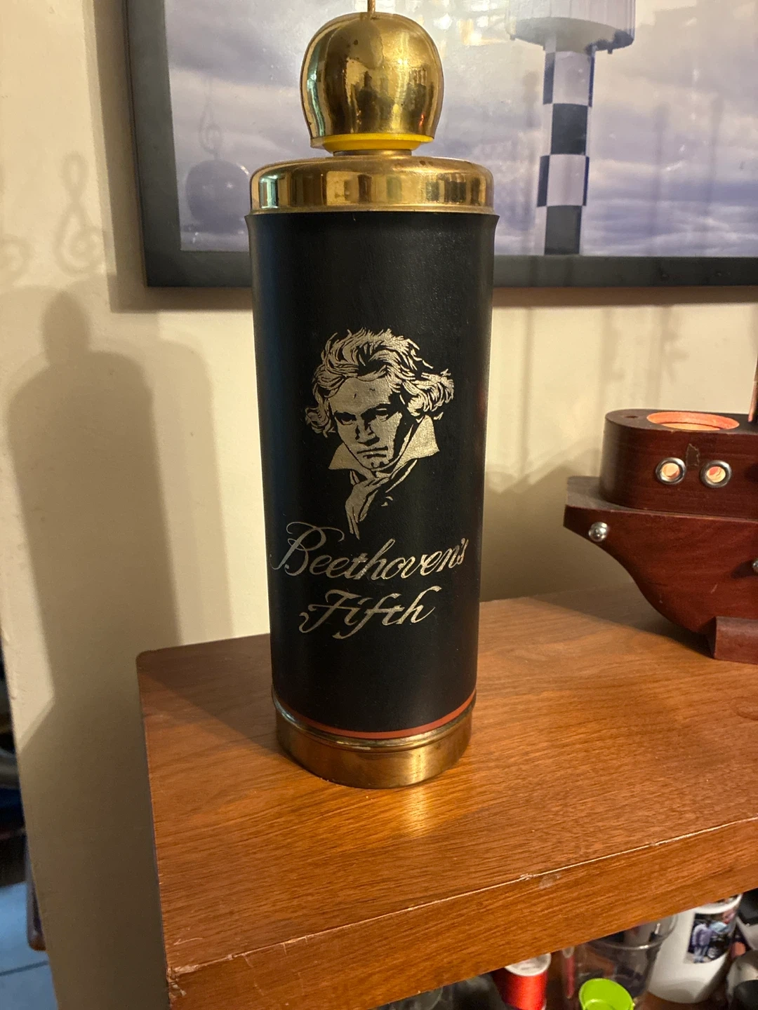 0This is a unique Beethoven's Fifth musical decanter. It has a black body with gold accents and a portrait of Beethoven. It would be a great addition to any music lover's collection!