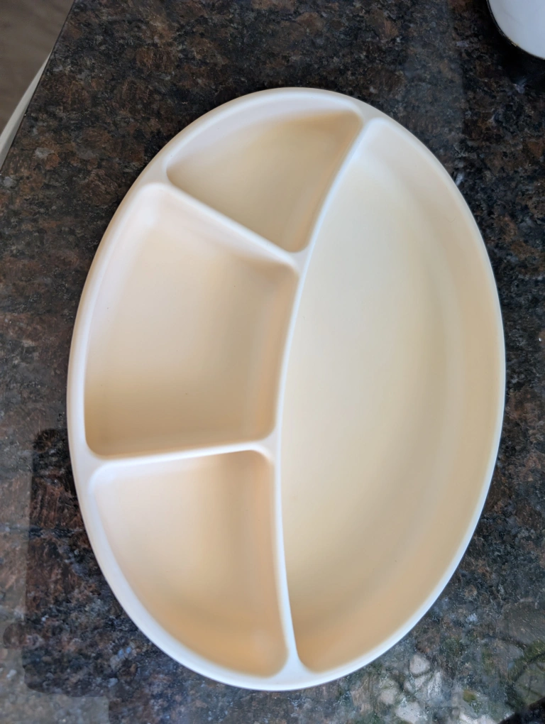 113gently used beige divided plate. It's perfect for separating foods or portion control. It's in great condition and ready for a new home