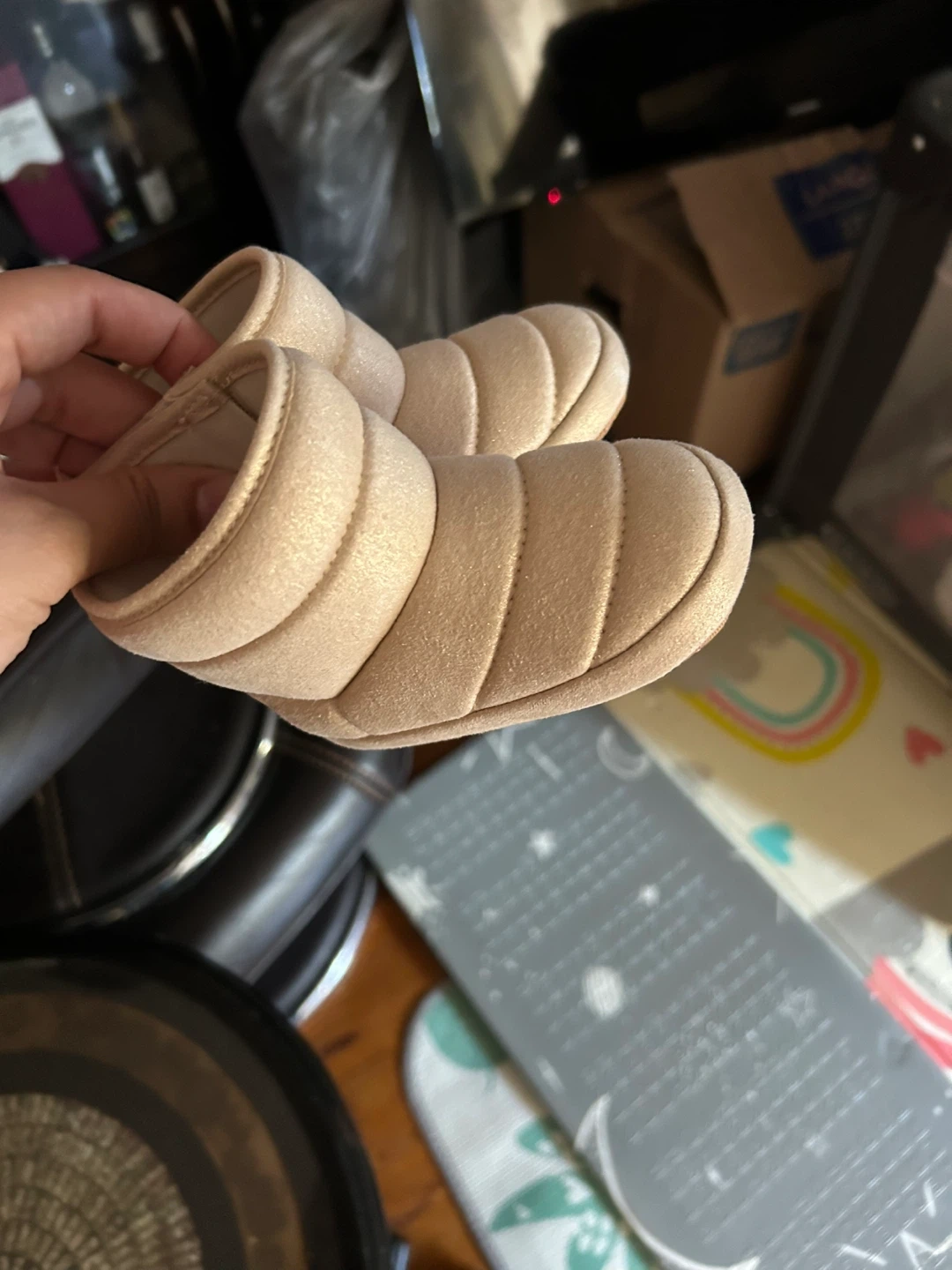 Selling these beige padded slippers. They are super comfy and in great condition! Perfect for wearing around the house 18-24months from old navy