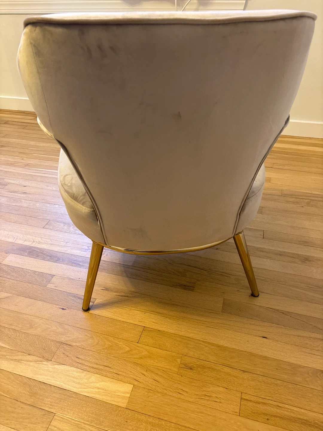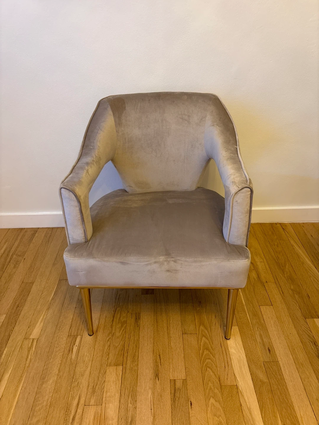 This stylish accent chair features a soft beige velvet upholstery and sleek gold legs. It's in great condition and would make a lovely addition to any room. Perfect for adding a touch of elegance and comfort to your living space