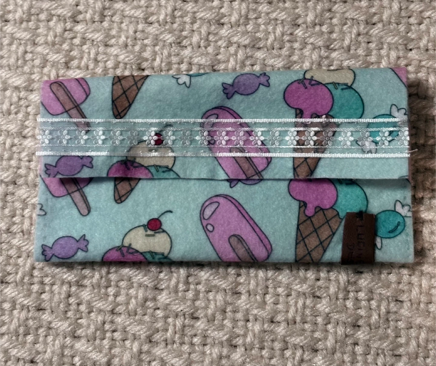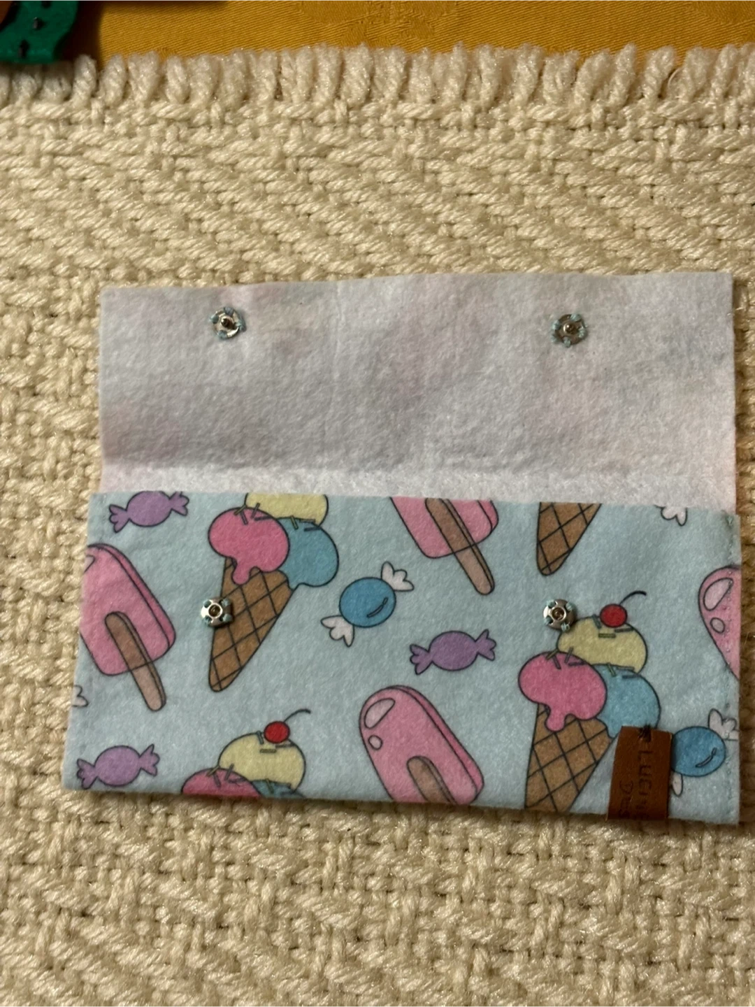 This felt pouch features a fun all-over print of ice cream cones and candies. It's secured with snap closures. Great for small items!
