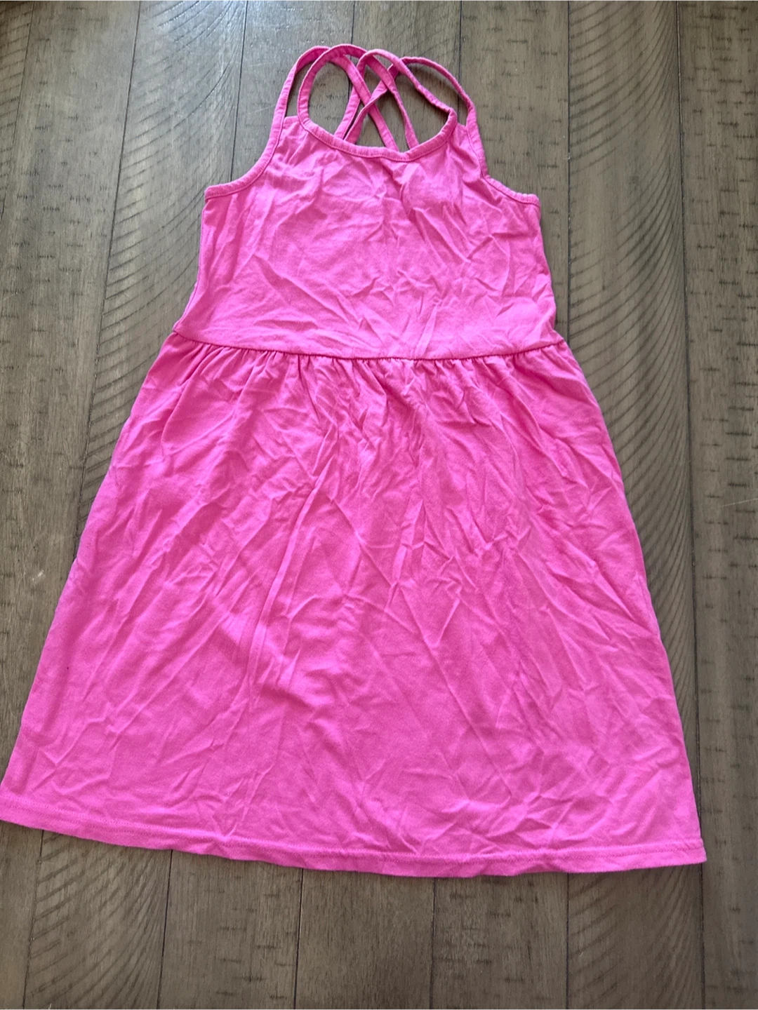 This is a cute pink spaghetti strap dress for girls. It has a criss-cross back detail and a gathered waist. The material is soft and comfortable.