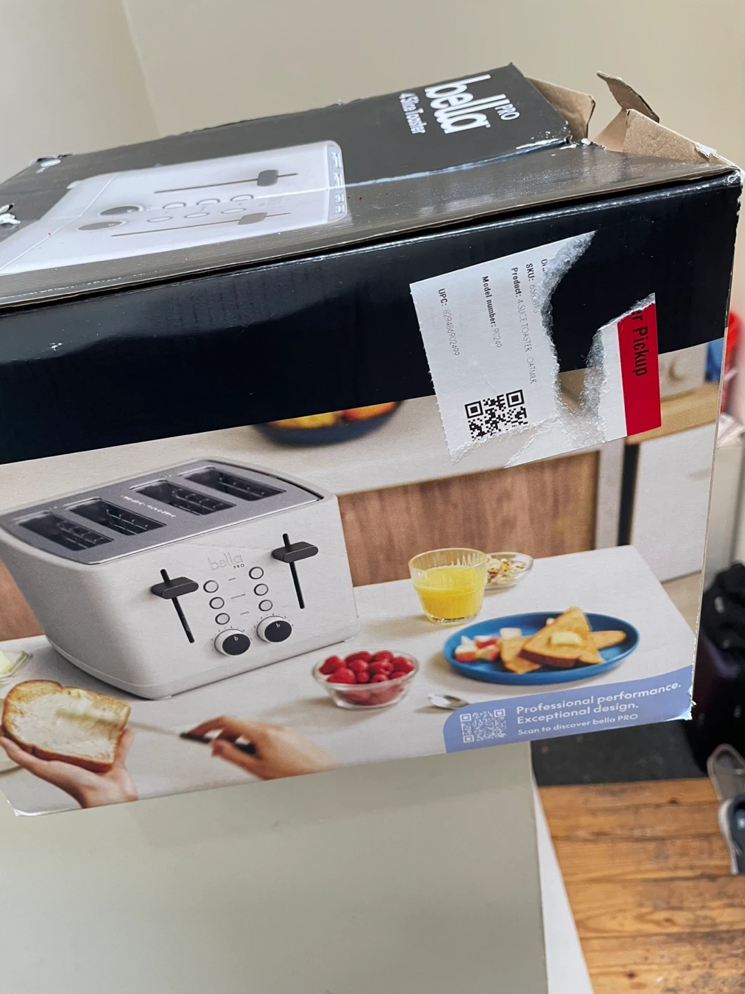 10Selling a Bella Pro Series 4-Slice Toaster. It's in like-new condition and comes with the original box. It features: - Extra-wide slots for various bread types - A high-lift lever for easy access to smaller breads - Bagel, gluten-free, and cancel buttons - Dual dial knobs with individual 6-setting shade control