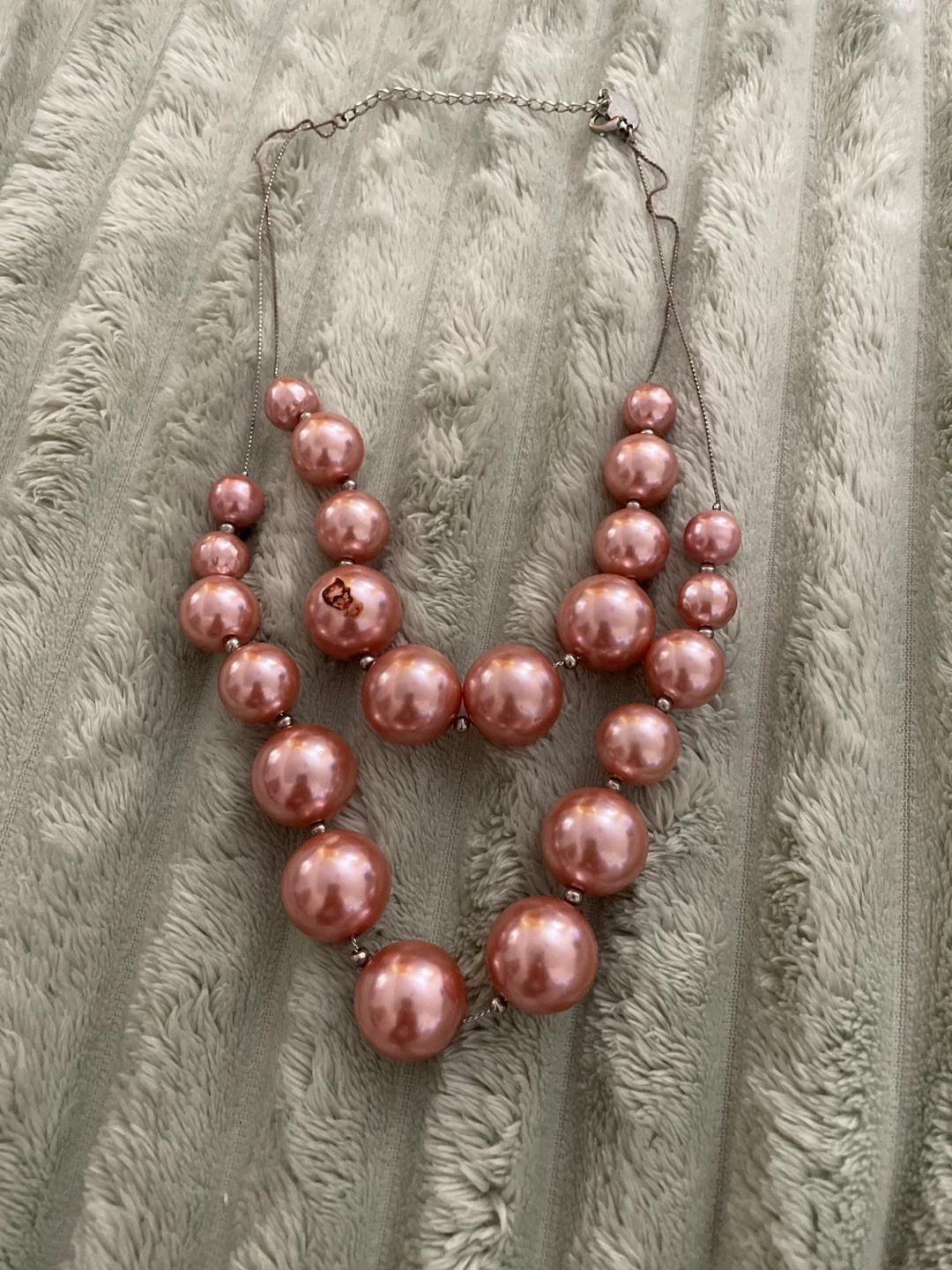 This necklace features chunky, rose-gold colored faux pearls. It's strung on a silver-tone chain. A fun accessory for any outfit!