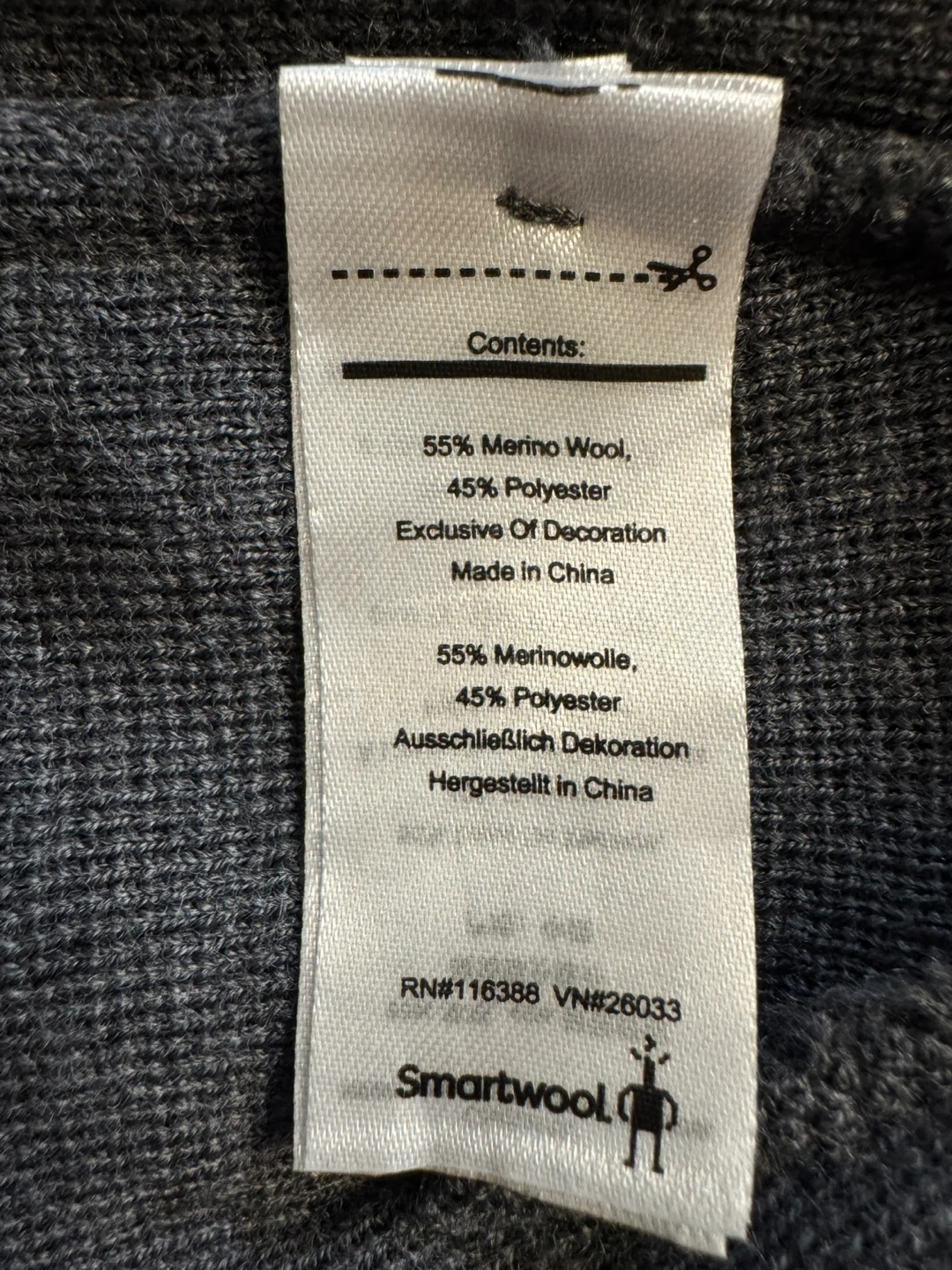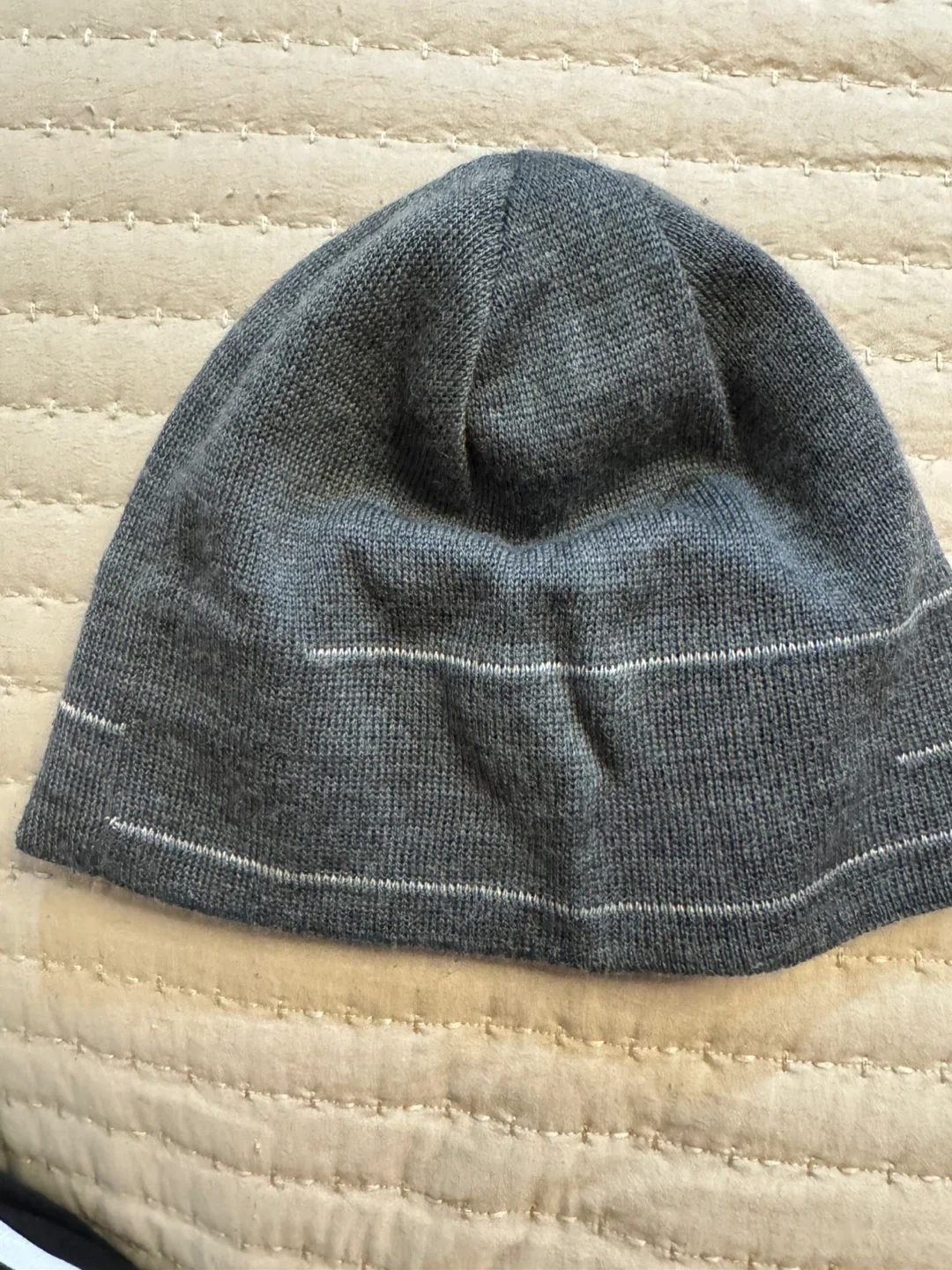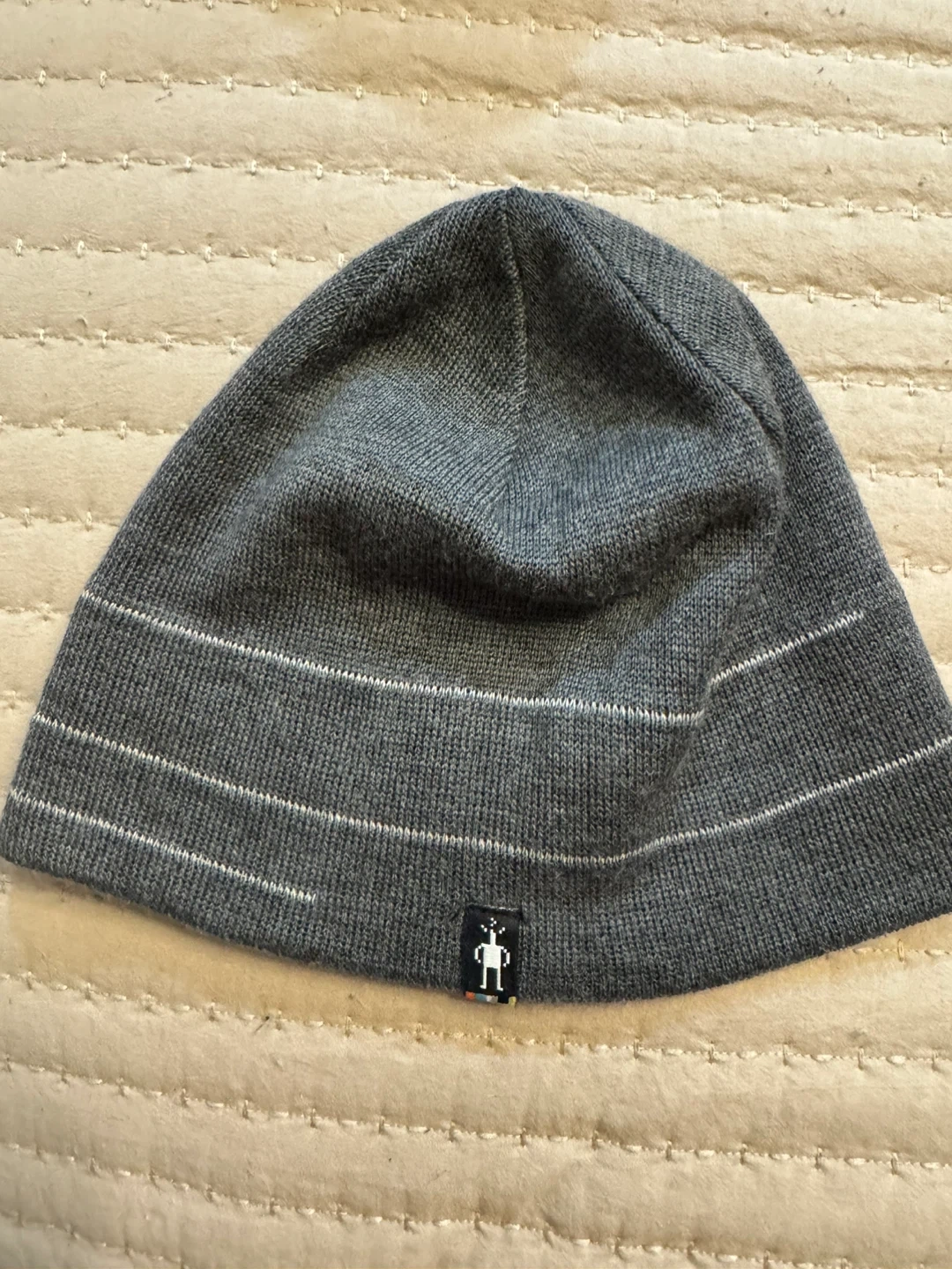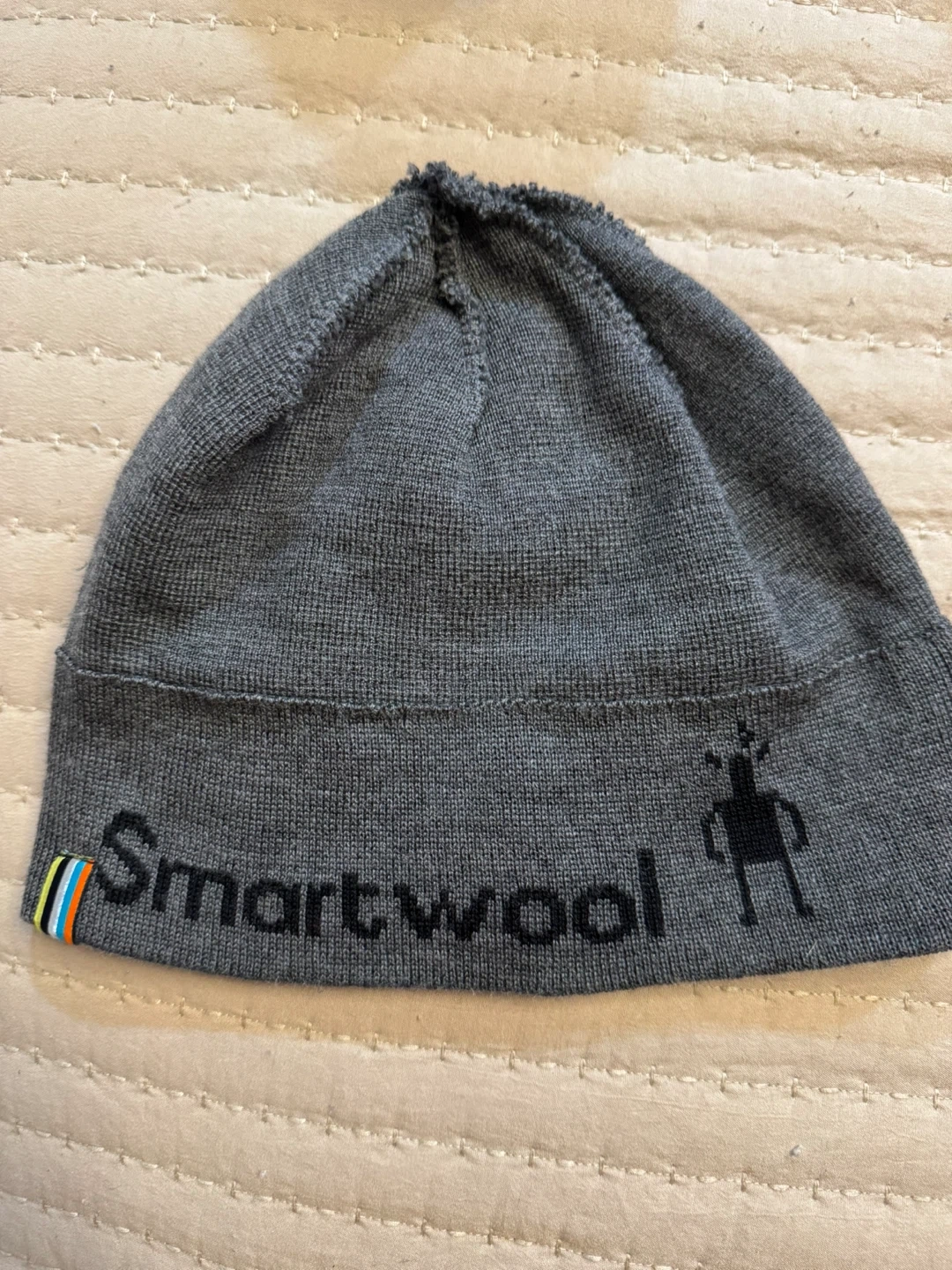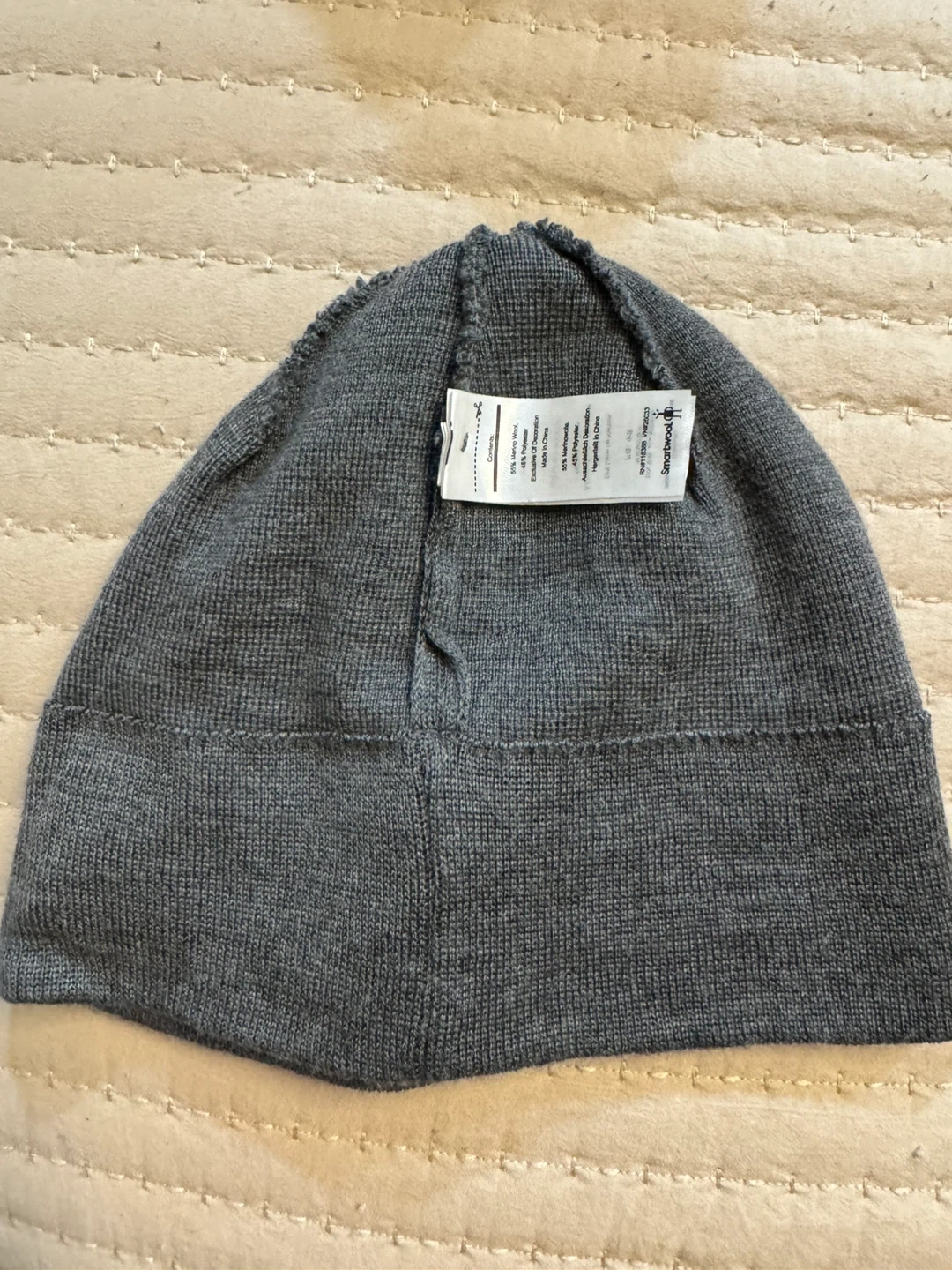 This is a grey Smartwool beanie. It's made of 55% Merino Wool and 45% Polyester. Made in China. It's a great hat for cool weather!