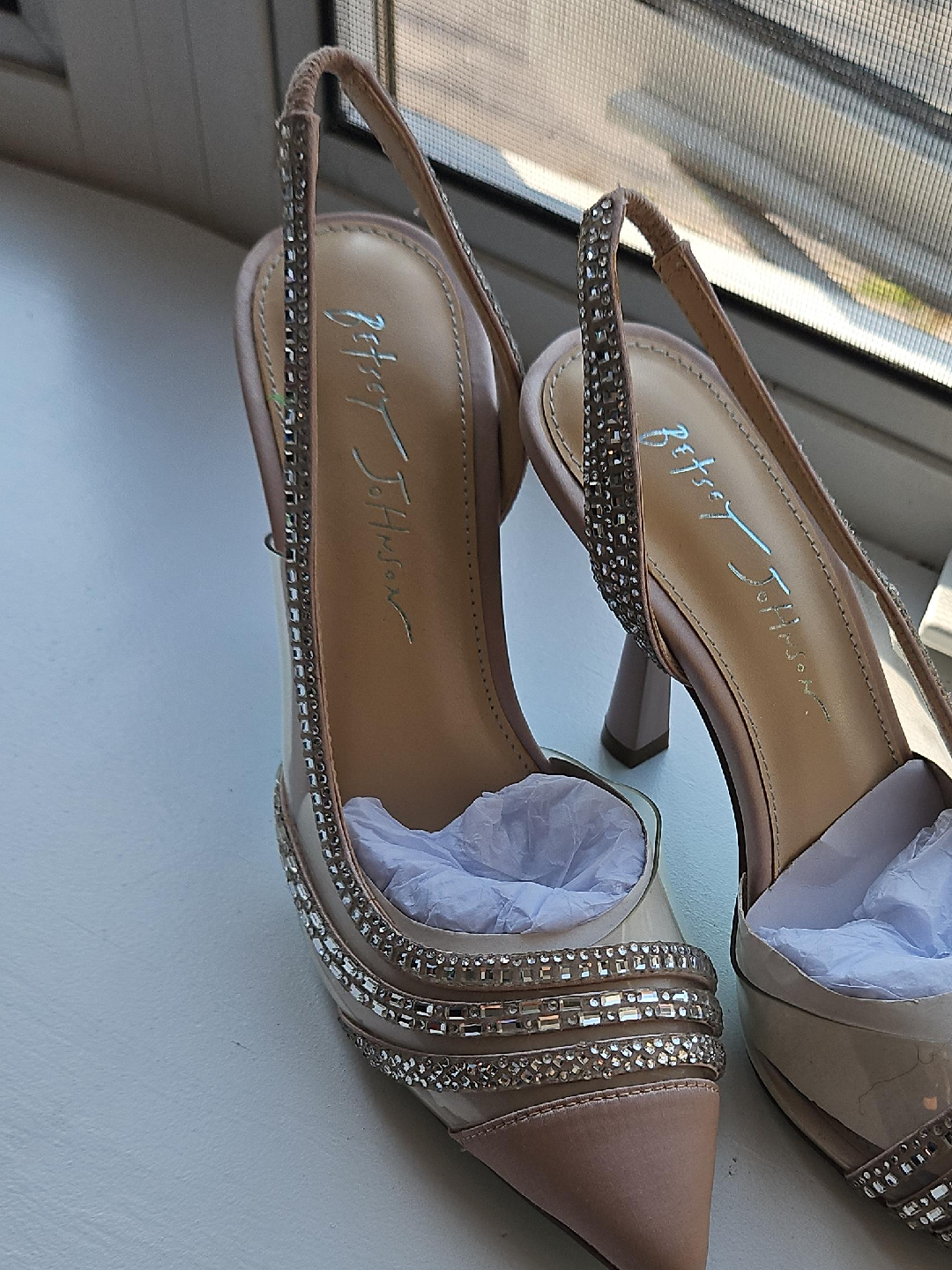 Selling a pair of Betsey Johnson heels. They feature a slingback design and are embellished with rhinestones. Perfect for dressing up!