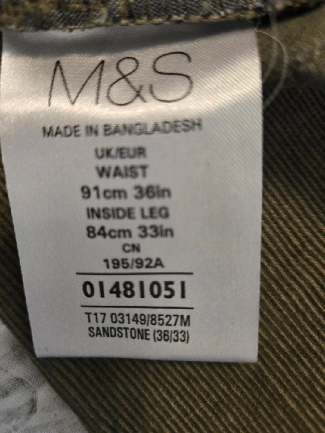Selling a pair of M&S (Marks & Spencer) straight fit corduroy pants. The waist size is 36 inches and the inside leg is 33 inches. The colour is sandstone. They're in great condition and ready for a new home!