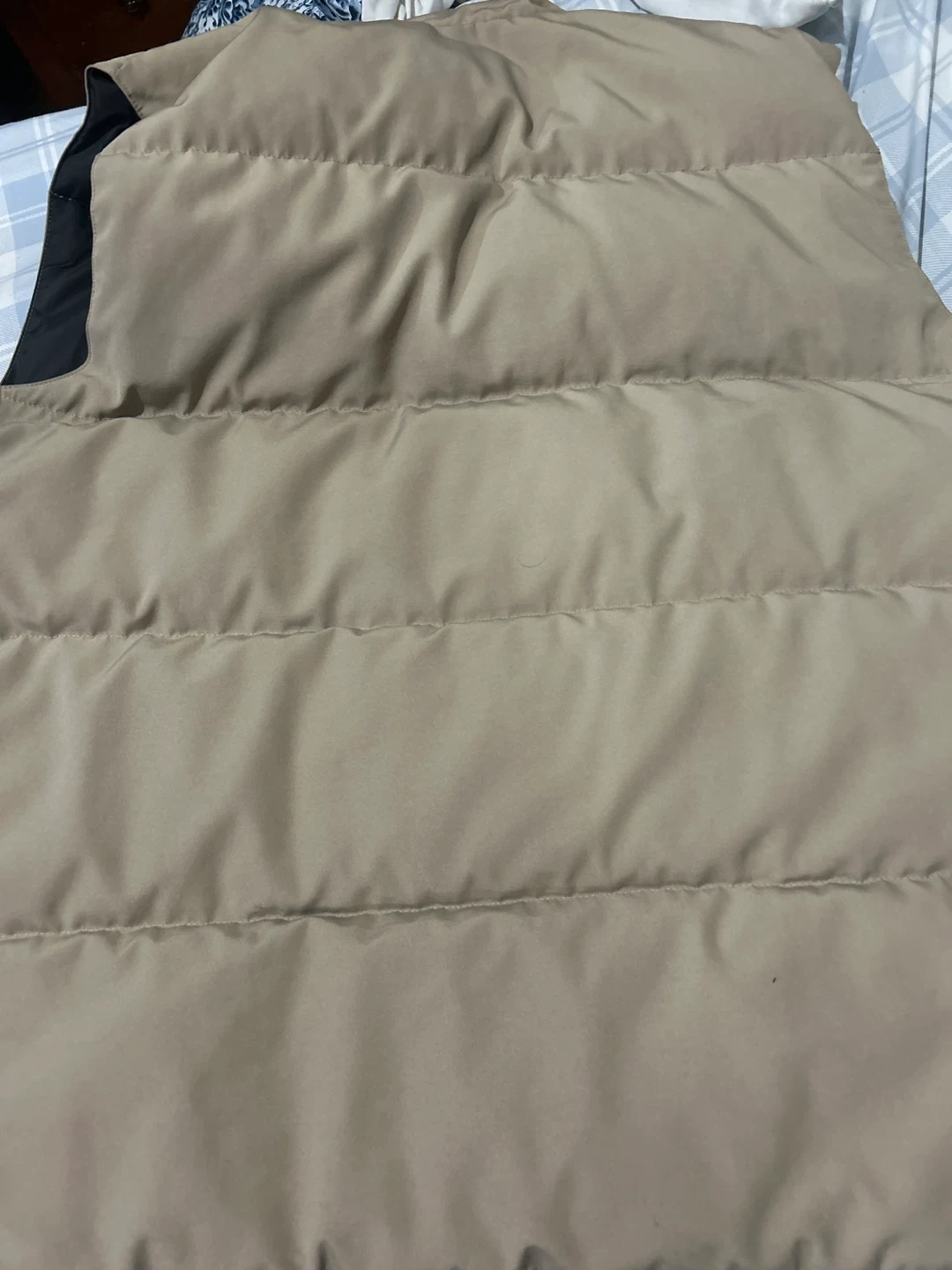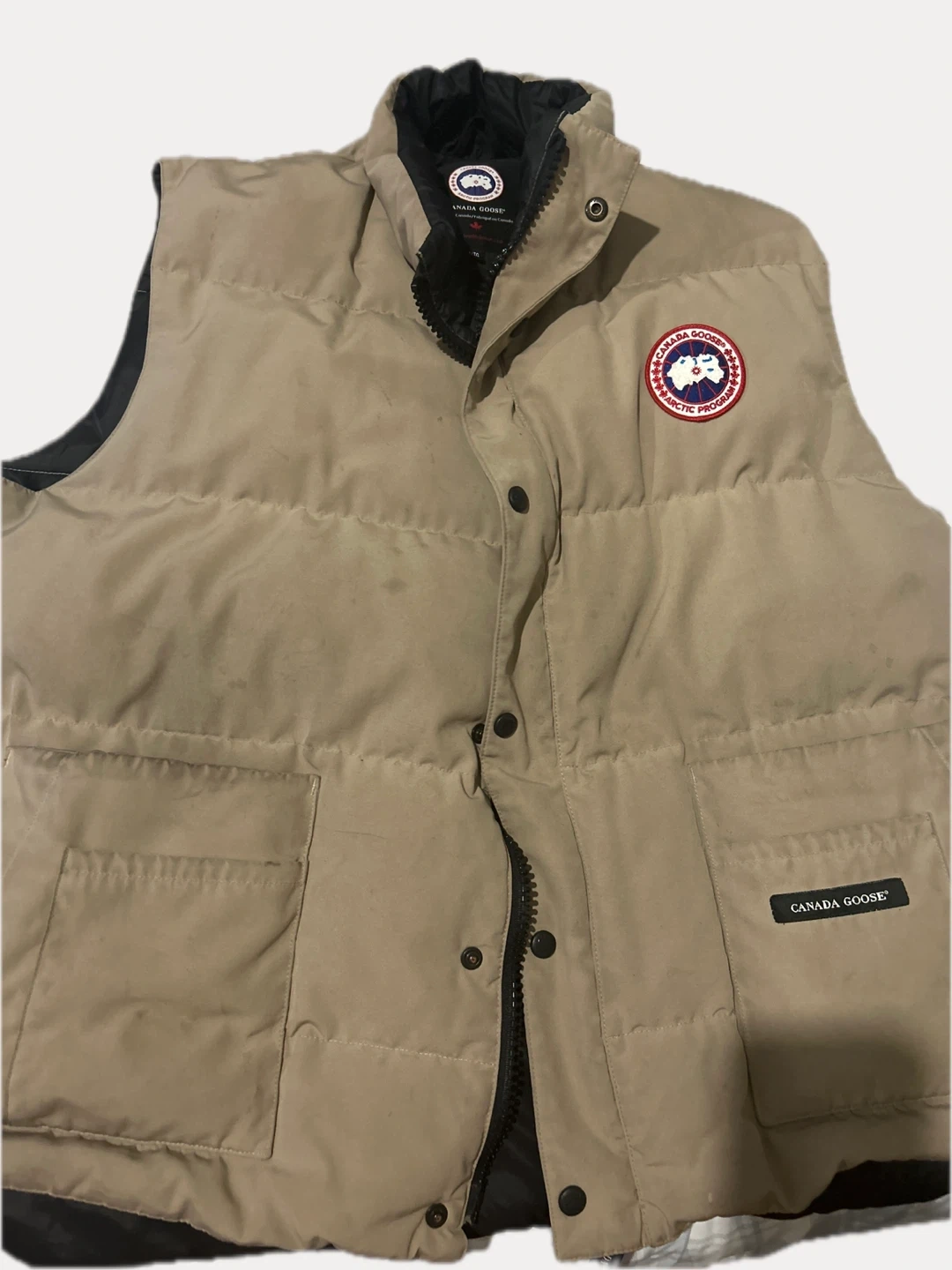 This is a Canada Goose puffer vest in a tan colour. It's a sleeveless jacket with a zip-up front and snap closures. The interior is lined with black material and features quilted insulation.