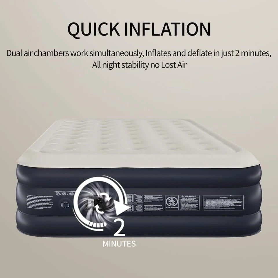 QUICK SELF INFLATING: Air mattress queen with built in pump with Double air chamber Dual air chambers work simultaneously, Inflates and deflate in just 2 minutes. STRONG LOAD BEARING: Queen air mattress with built in pump internal coil beam construction provides solid support to maintain stability, max weight capacity of 650 lbs, With inflated dimensions of 80 x 60 x 16 . COMFORTABLE SLEEPING: Queen air mattress multi layer soft top flocking creates an amazingly comfortable sleeping experience soft top flocking is waterproof and odor proof for a more peaceful sleep. NON SLIP STABILITY: Multi layer puncture resistant PVC materials reinforce the Camping blow up mattress while maintaining its shape and firmness, prevent leaking and provide air mattress bottom non slip stability. APPLICABLE SCENE: Air Mattress Queen With Built in Pump for camping, home, guests & portable travel, It can also be a carefully selected gifts for women and men.