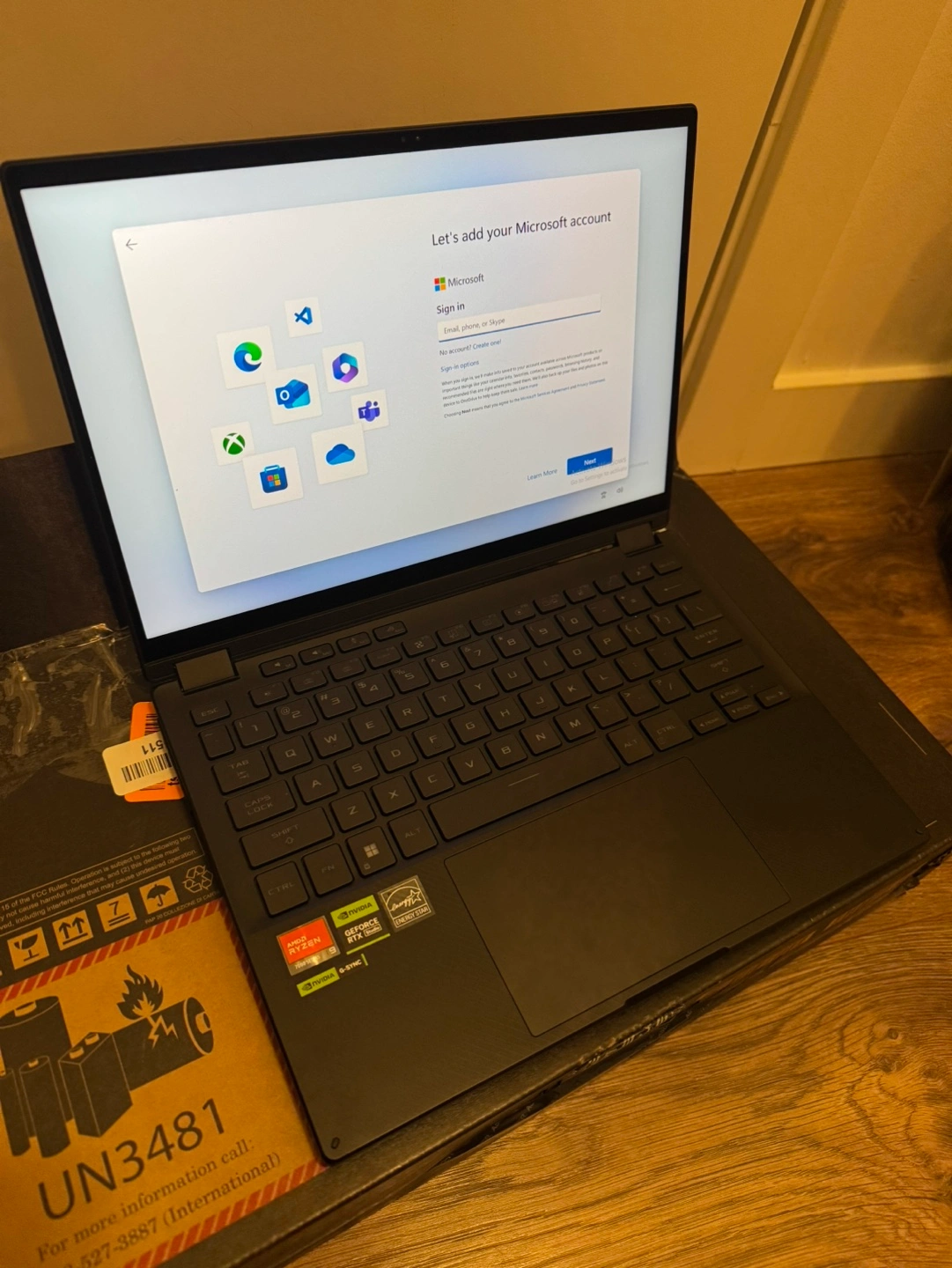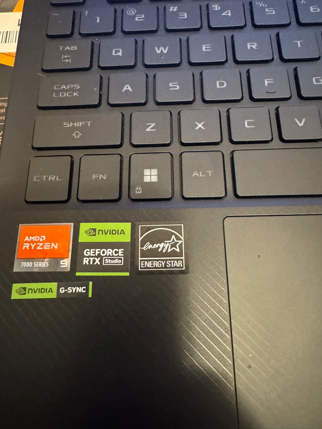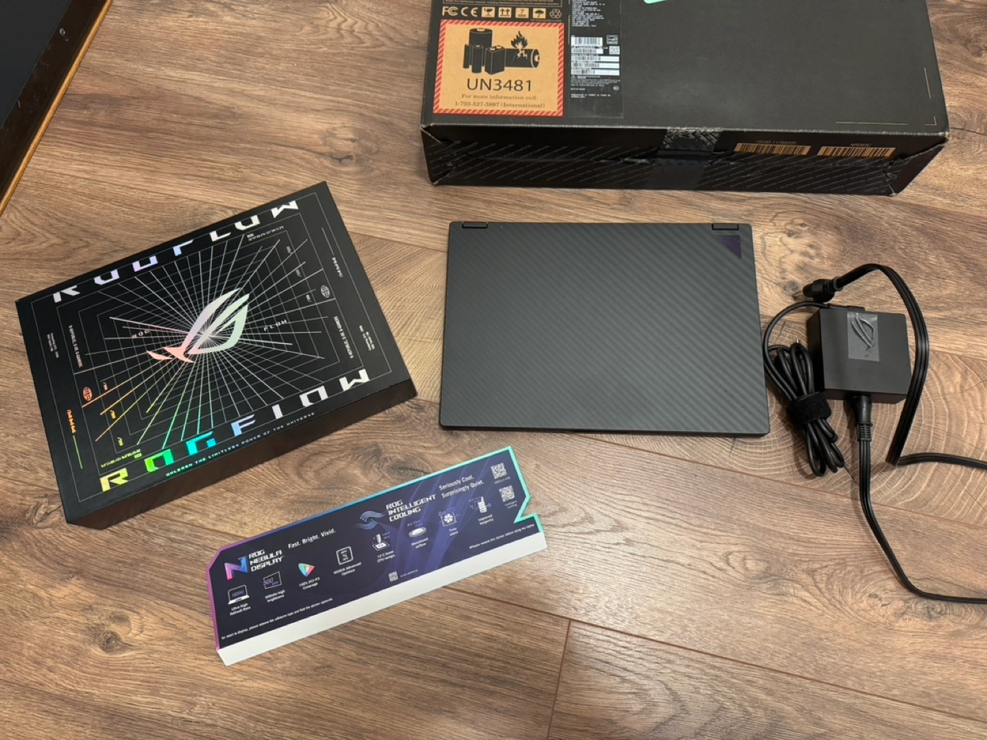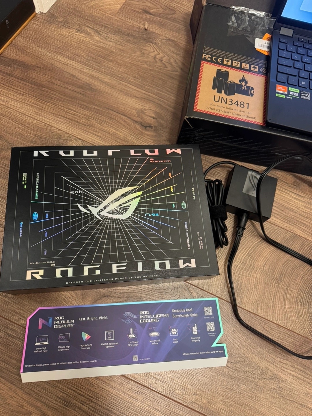 Laptop with charger, box and other accessories. Windows 11. AMD Ryzen processor, Nvidia GeForce RTX graphics, G-Sync.