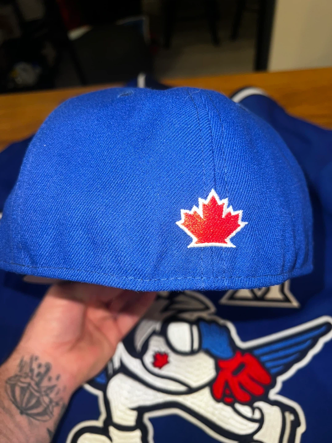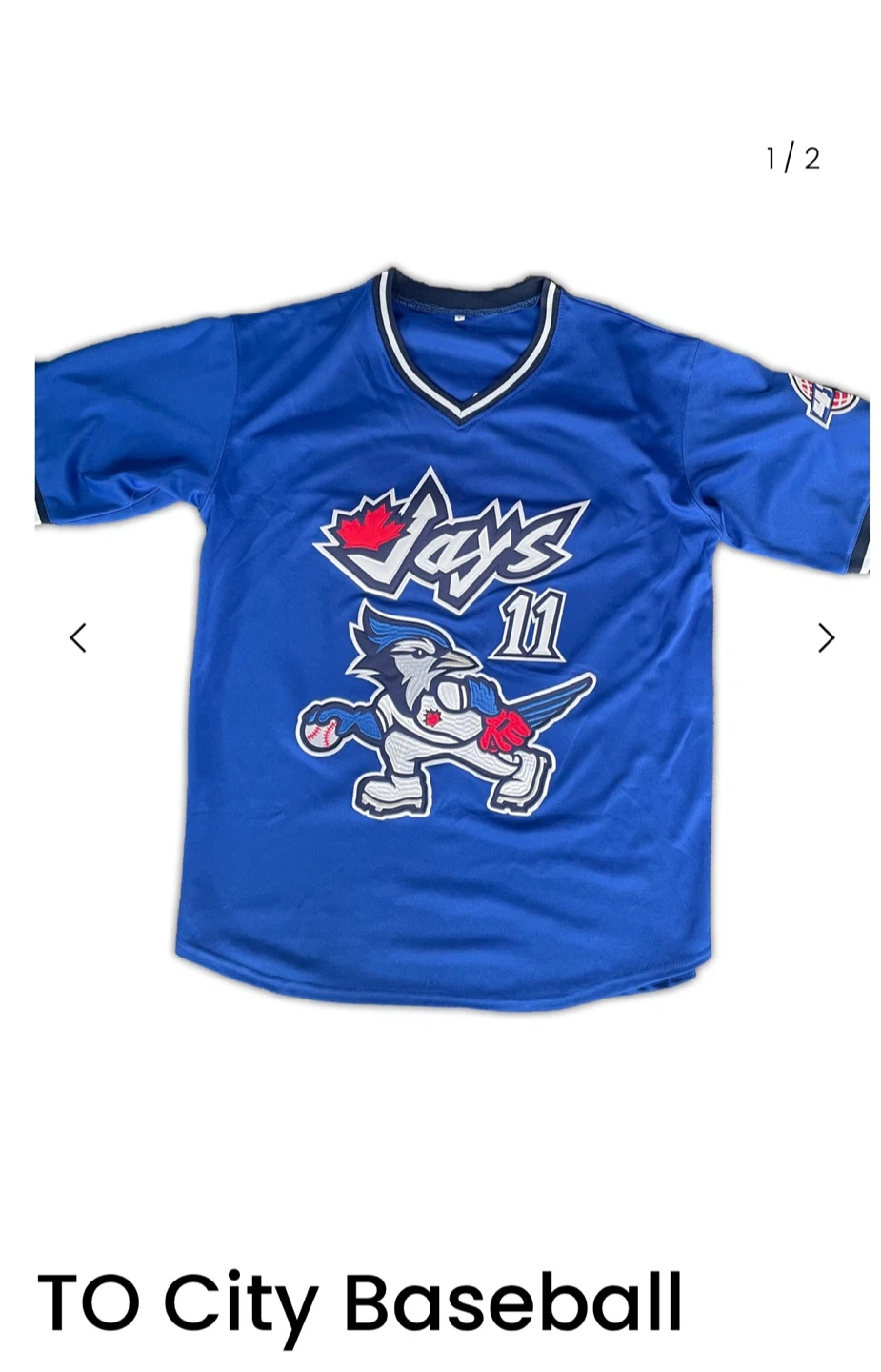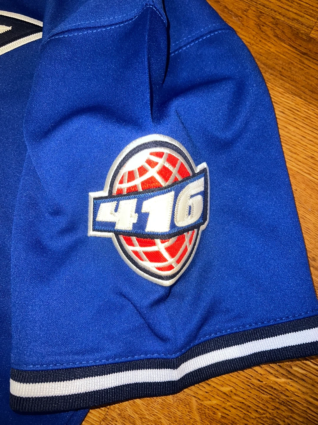 This is a Toronto Blue Jays jersey featuring the "416" patch and the mascot. It also includes a matching blue New Era baseball cap with the team logo. Great for any Jays fan! Size Large 23 1/2 x 30 inches