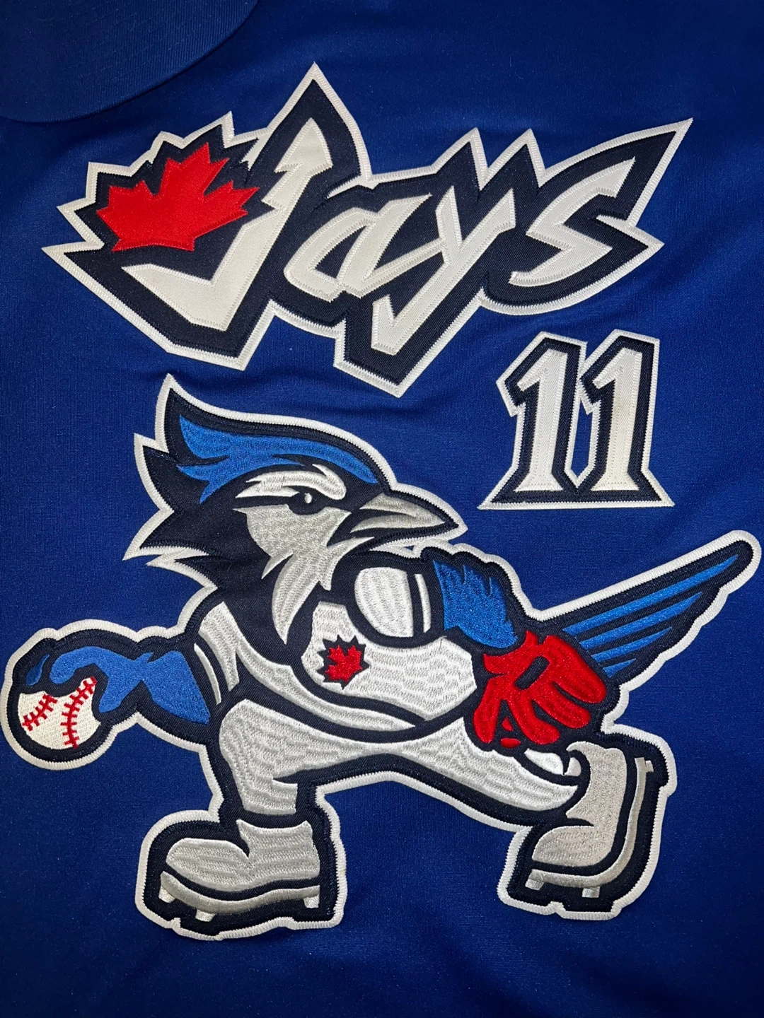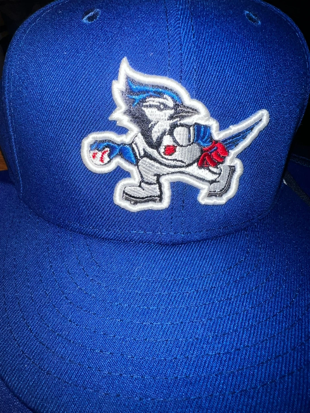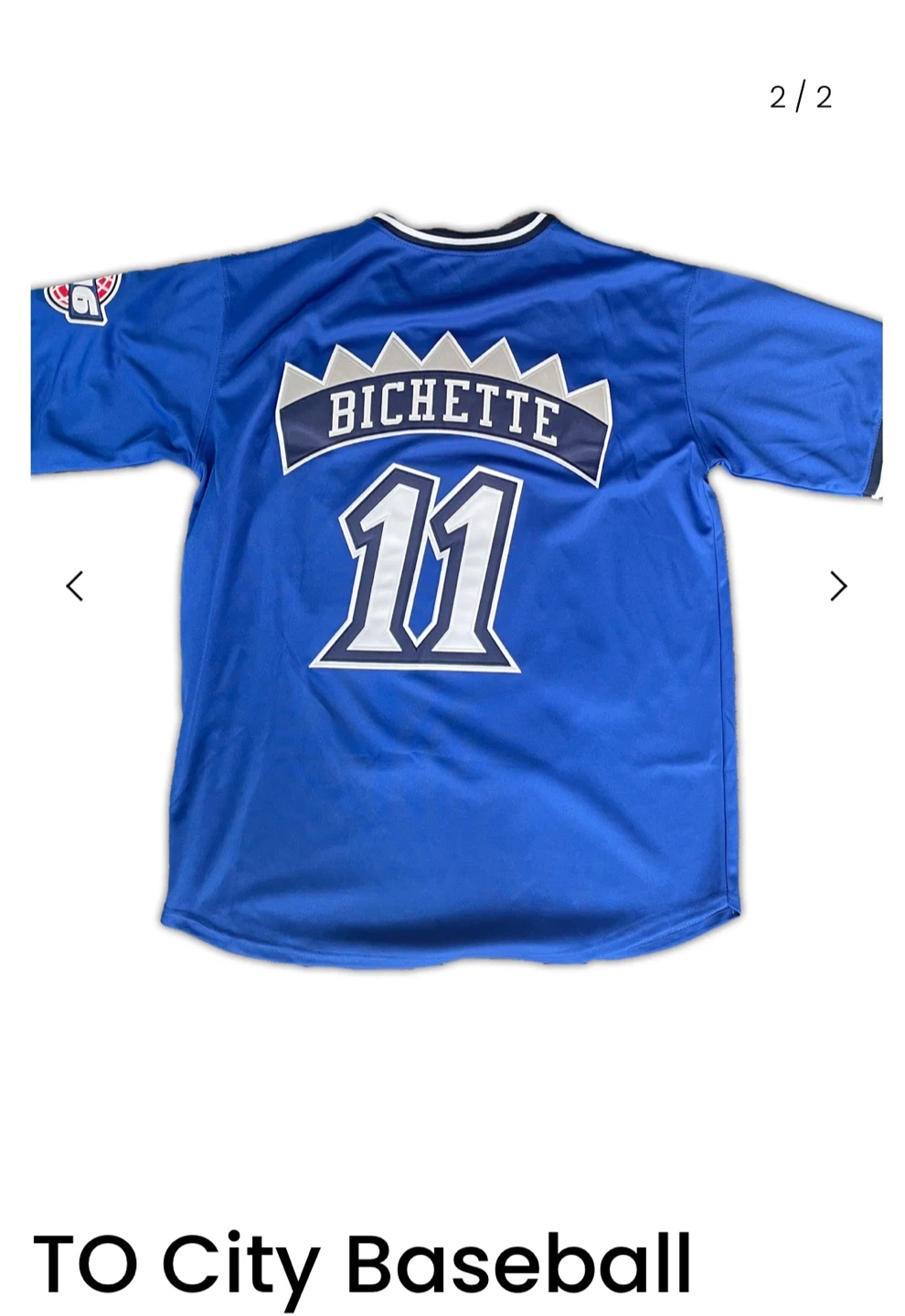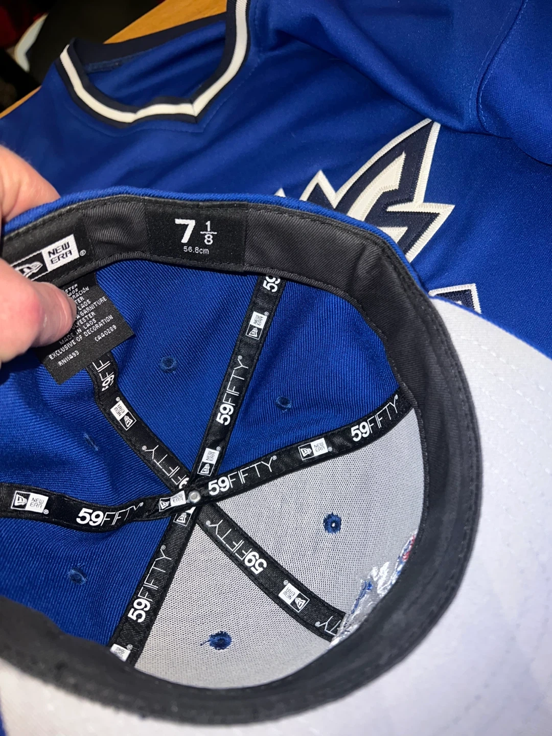 This is a Toronto Blue Jays jersey featuring the "416" patch and the mascot. It also includes a matching blue New Era baseball cap with the team logo. Great for any Jays fan! Size Large 23 1/2 x 30 inches