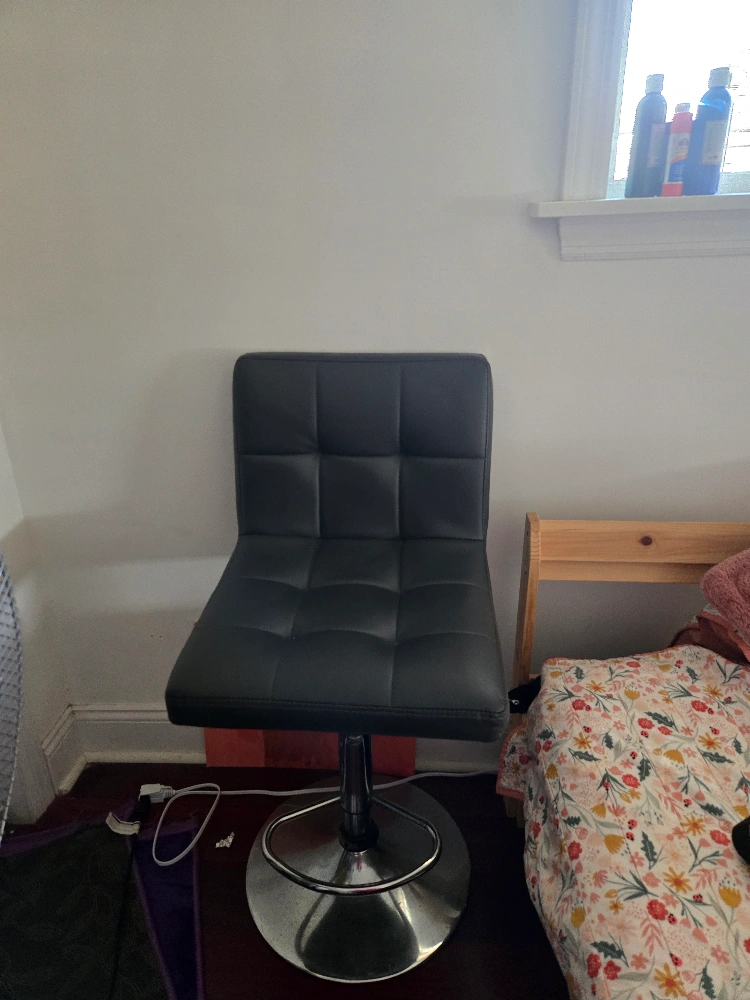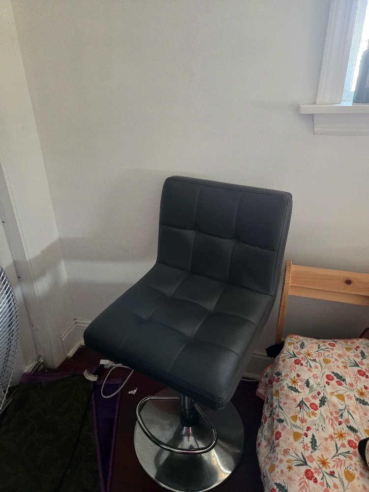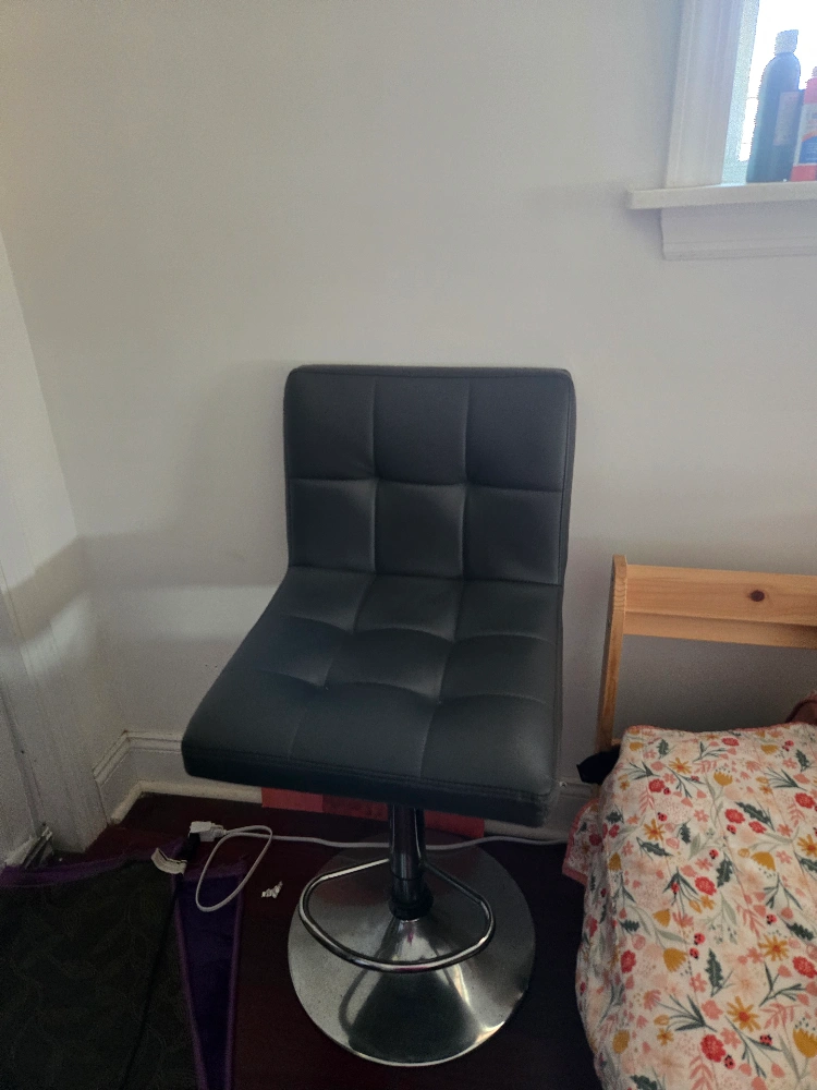 Selling a black bar stool with an adjustable height feature! It has a sleek design and would look great in any kitchen or bar area. The stool is in good condition and ready for a new home