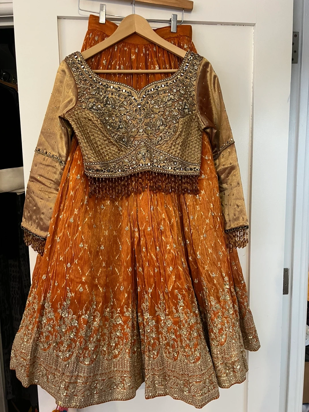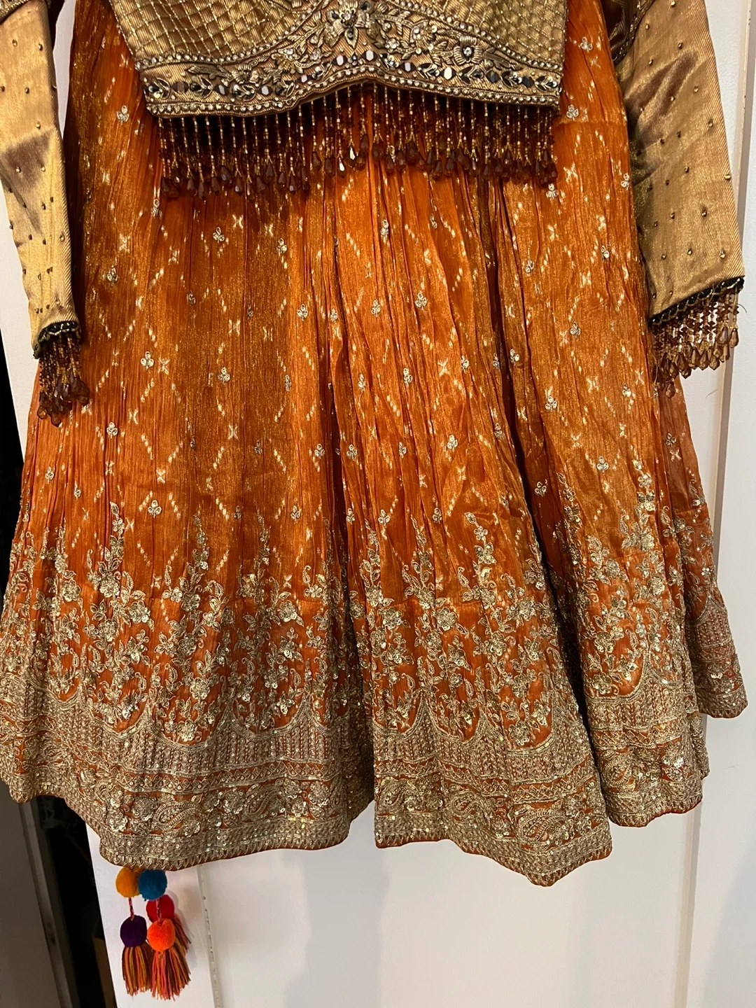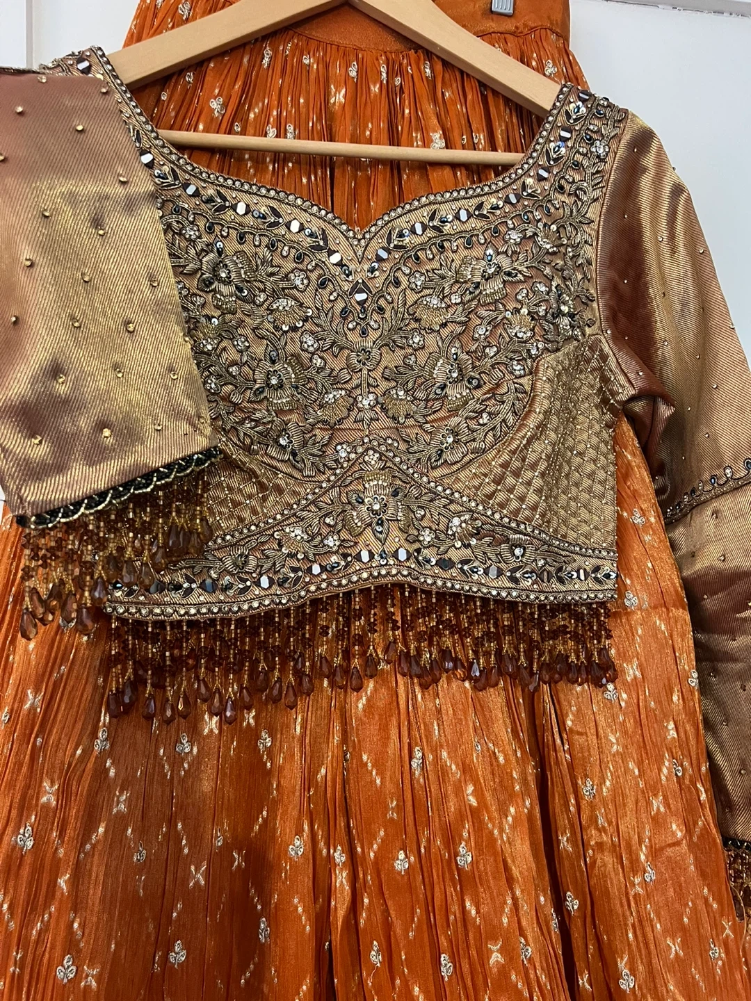 Stunning saffron lehenga choli set. Features intricate gold embellishments and beadwork on a shimmering fabric. Includes a matching blouse with detailed embroidery. Perfect for special occasions! Dupatta included.