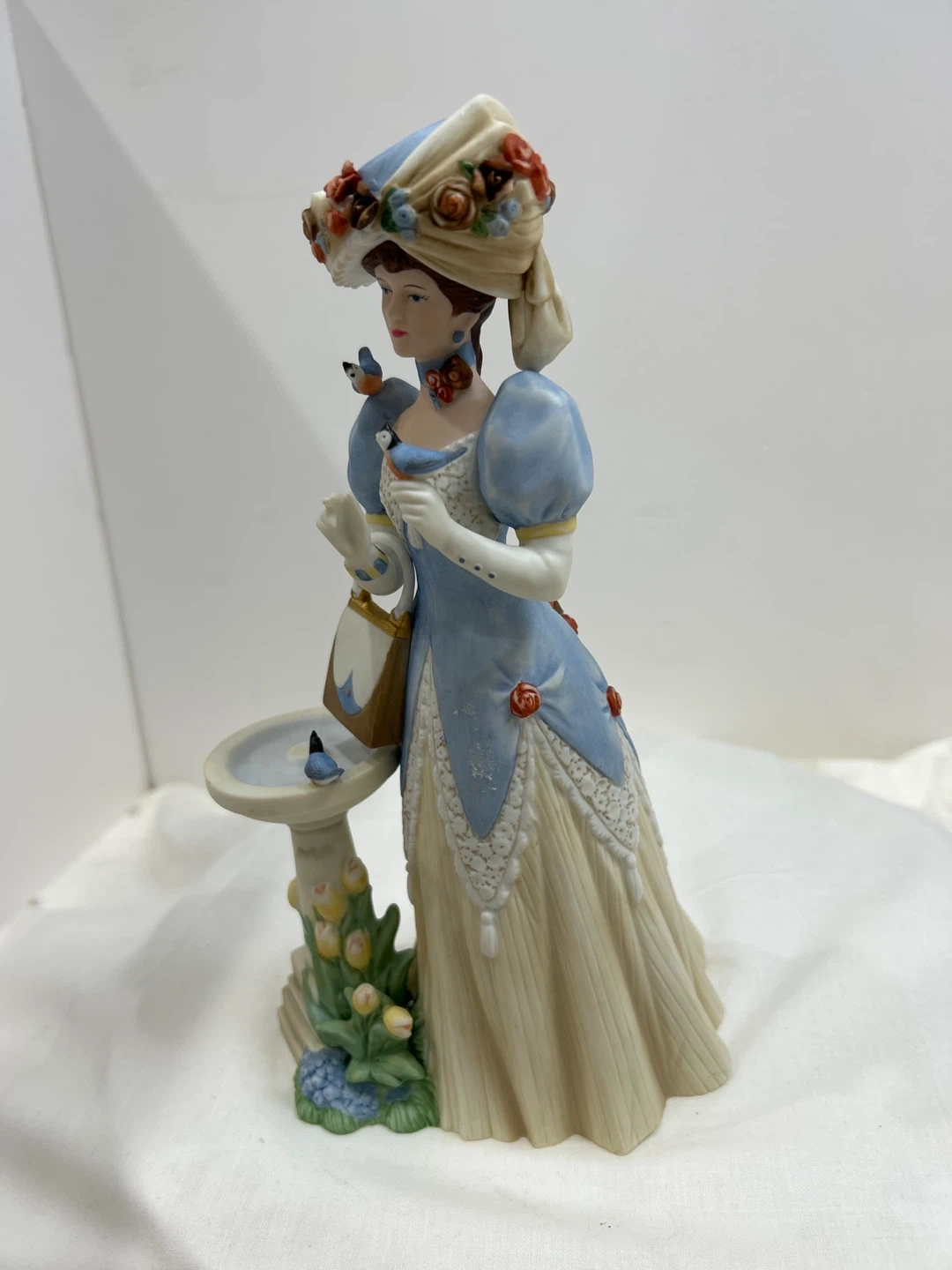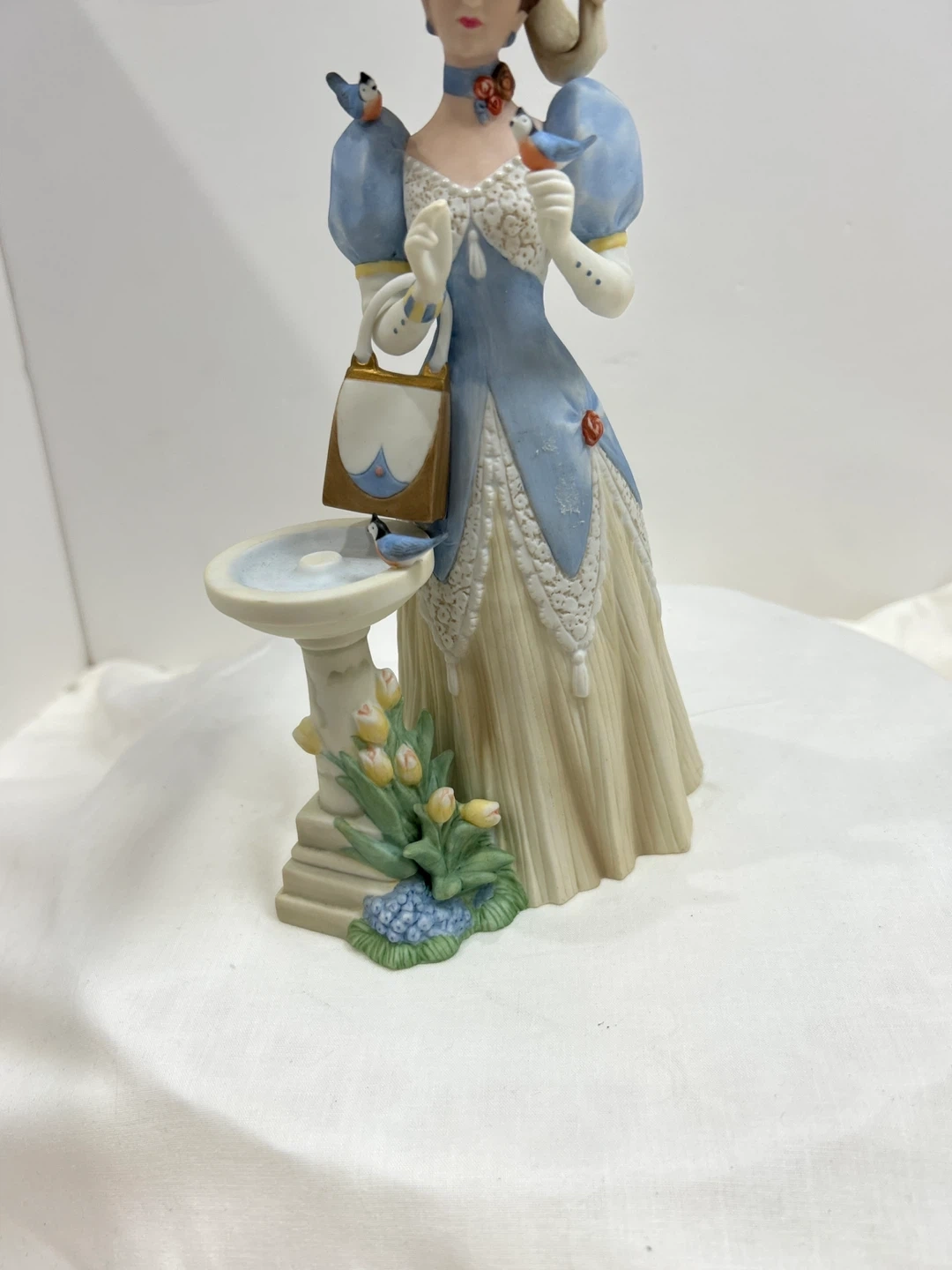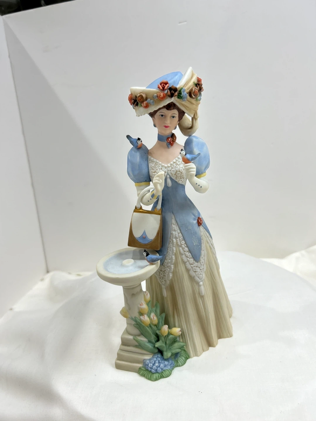 Vintage 1998 Mrs Albee award porcelain figurine A lovely porcelain figurine depicting a woman in a blue dress holding a purse, with a birdbath and flowers. It's a beautifully detailed piece, collectible 🏆