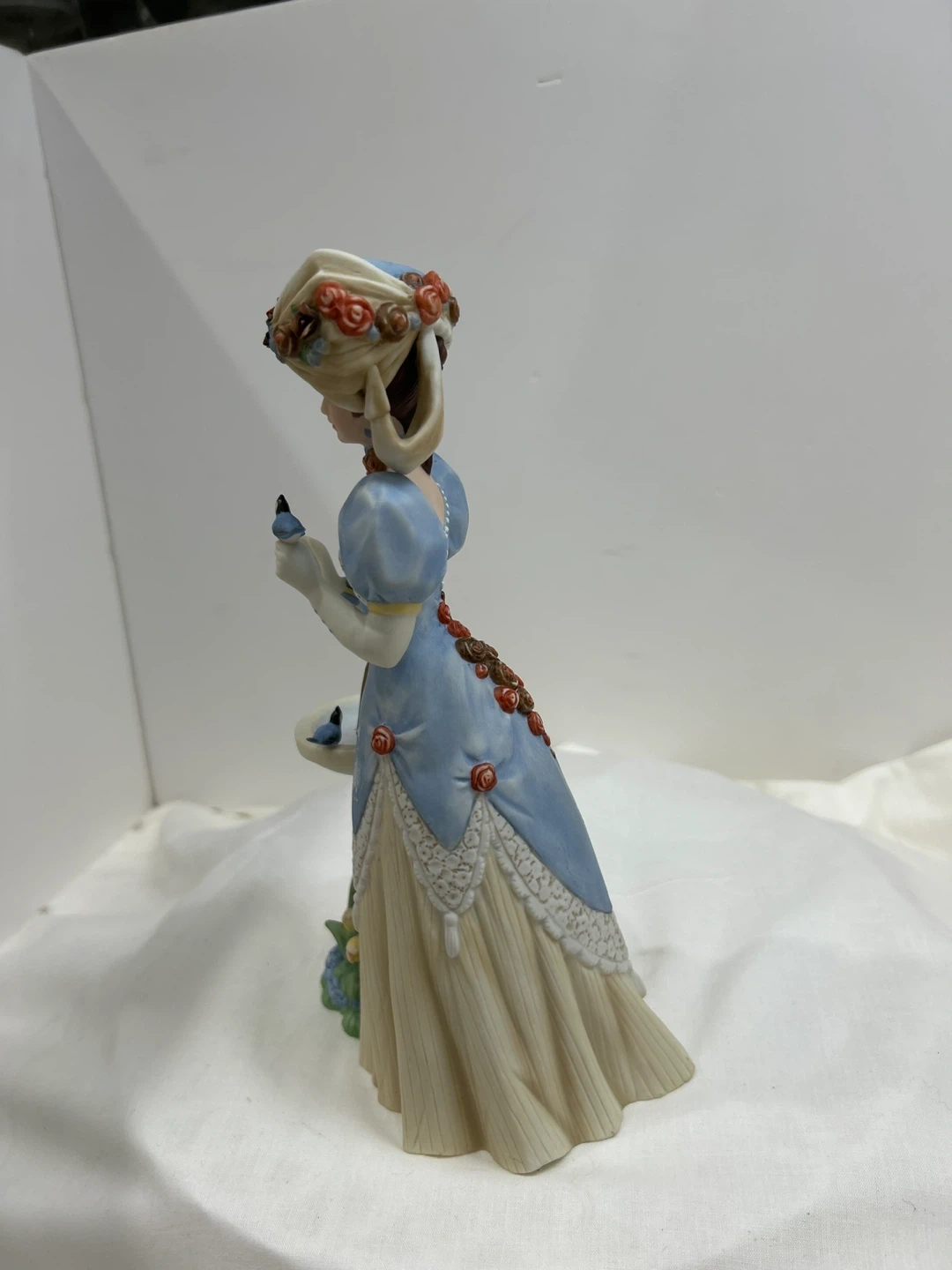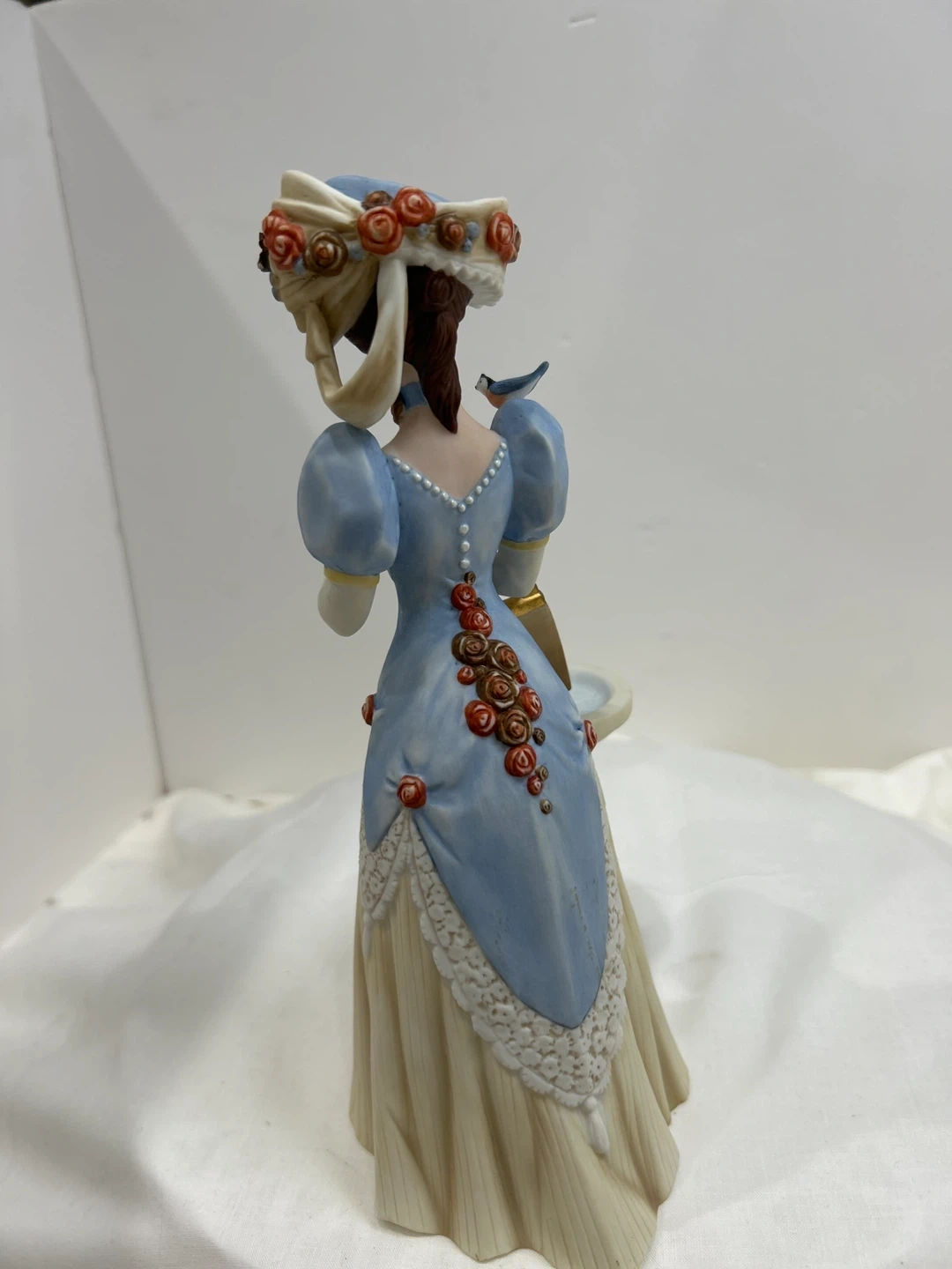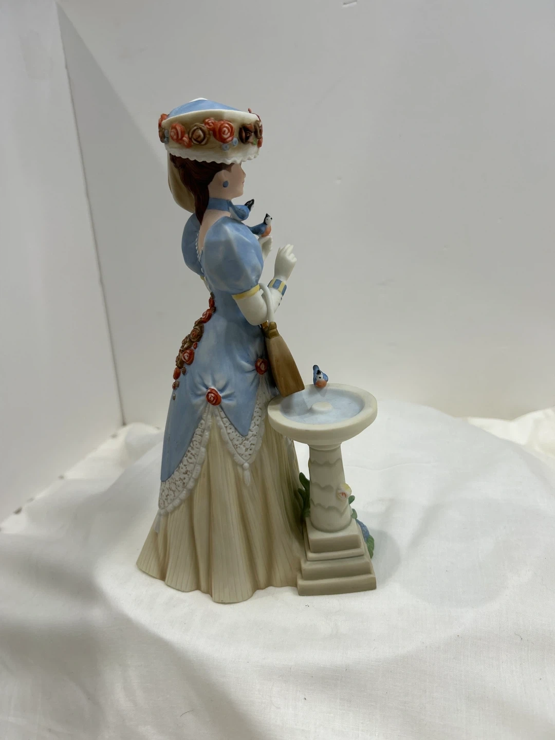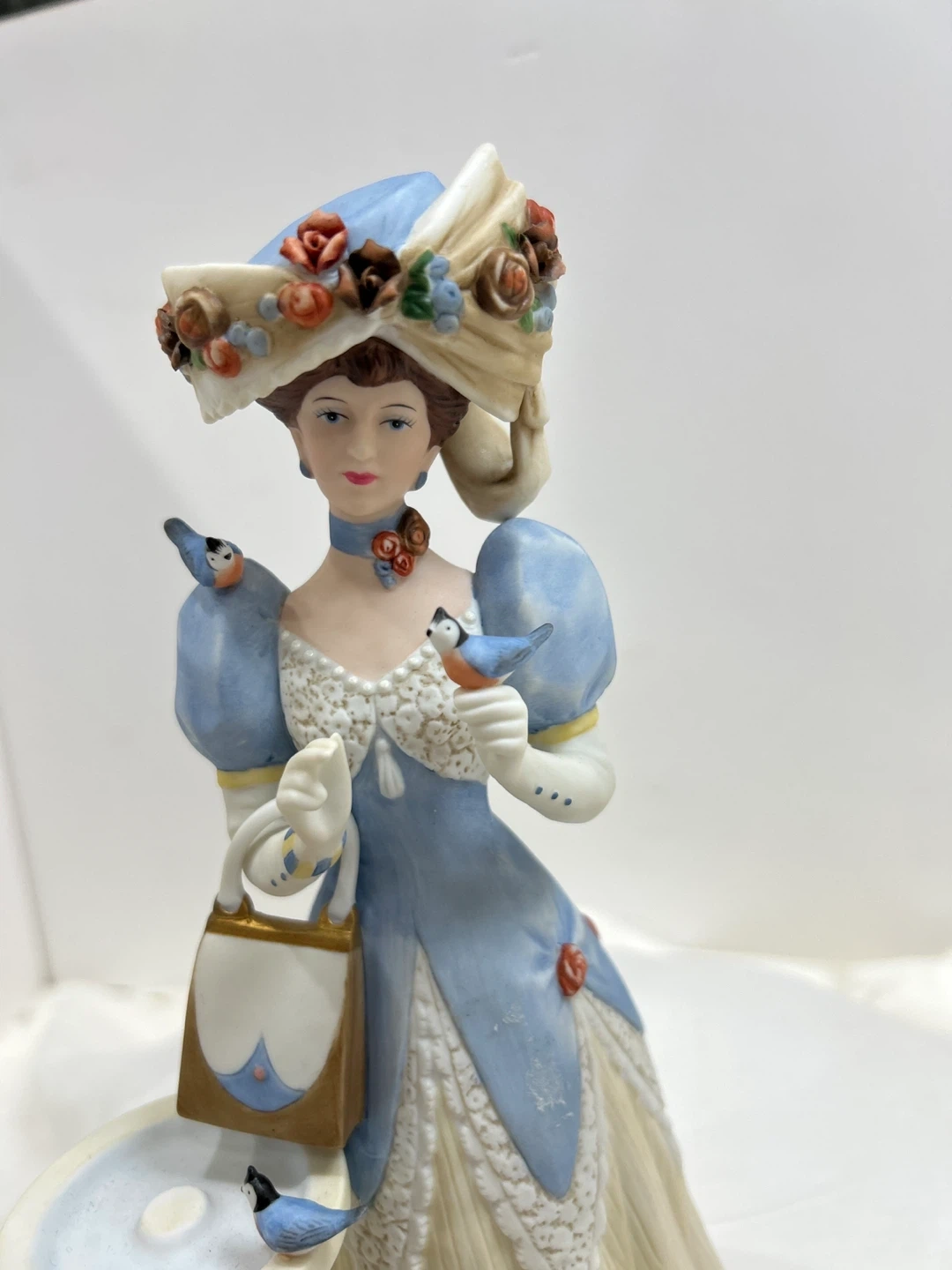 Vintage 1998 Mrs Albee award porcelain figurine A lovely porcelain figurine depicting a woman in a blue dress holding a purse, with a birdbath and flowers. It's a beautifully detailed piece, collectible 🏆