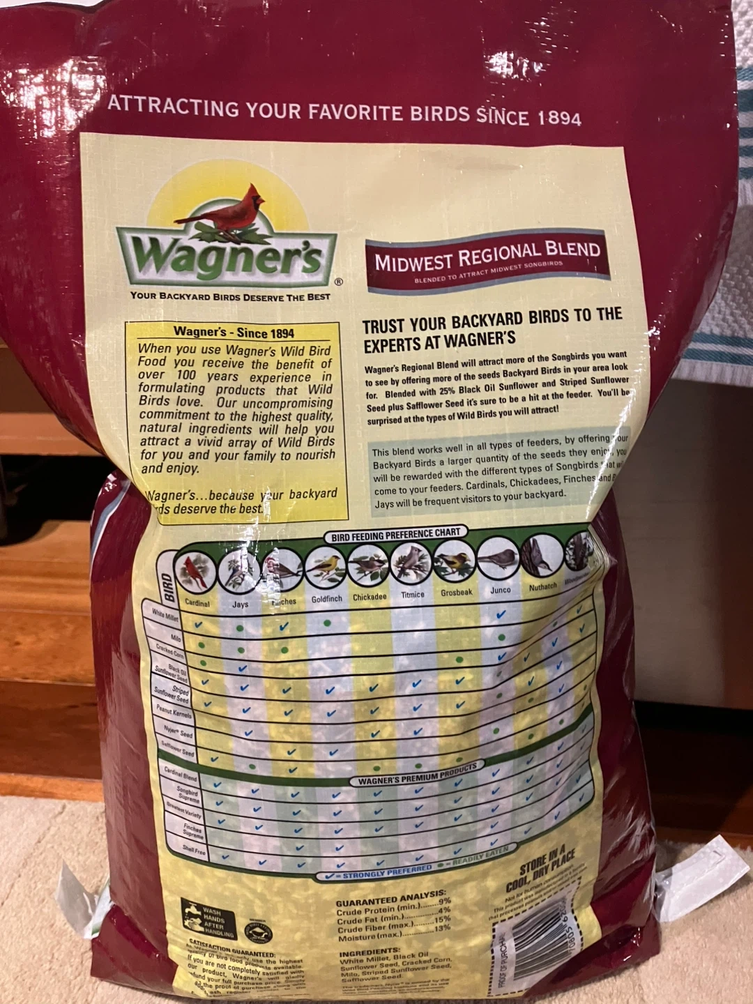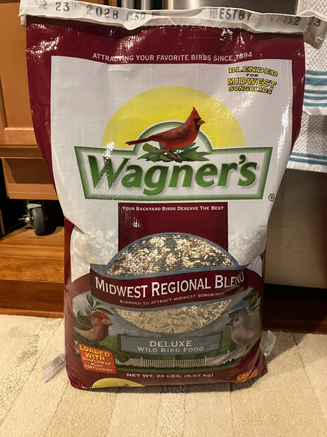 The wild birds are hungry! This is Wagner's Deluxe Wild Bird Food, a Midwest Regional Blend. It's a 20 lb bag of birdseed. The blend is designed to attract various songbirds. Expires 2028! Cash and pick up only. Over 20.00 on Chewy!