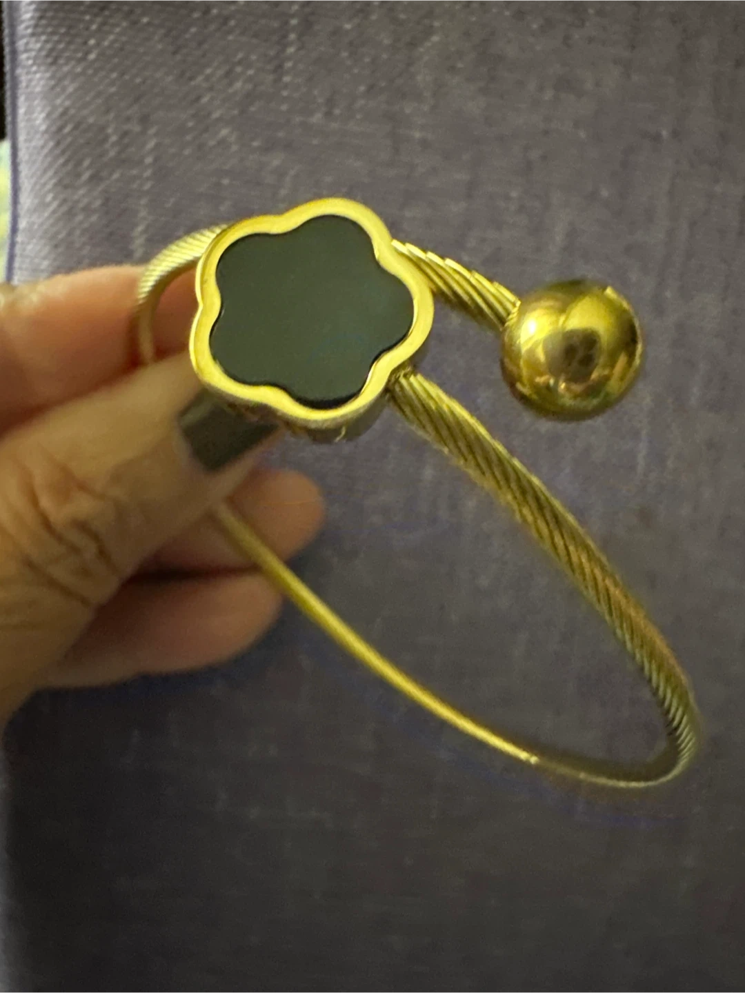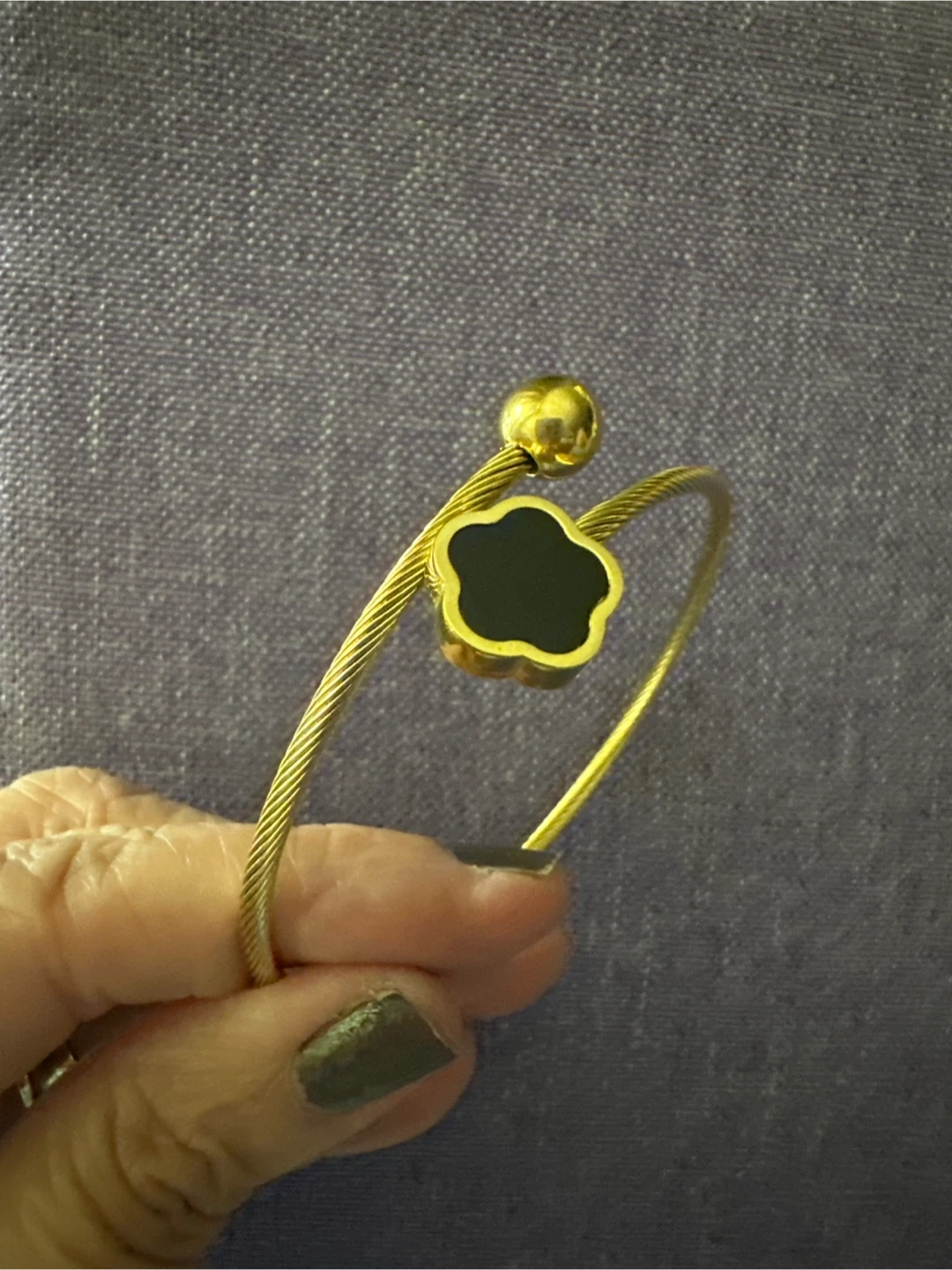 This bracelet features a gold-tone twisted band with a clover-shaped charm. The charm has a black inlay. It's an adjustable cuff style. Offers a classic look!