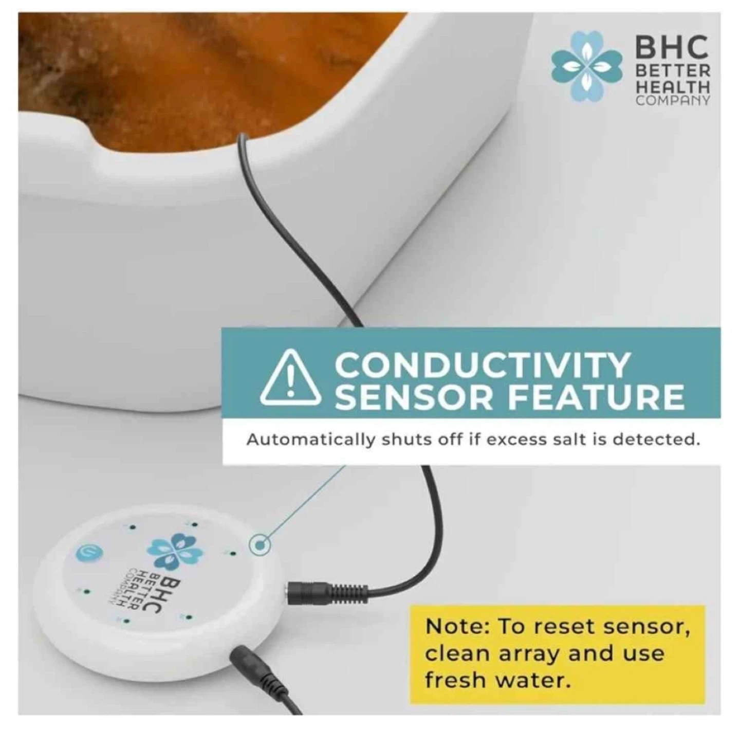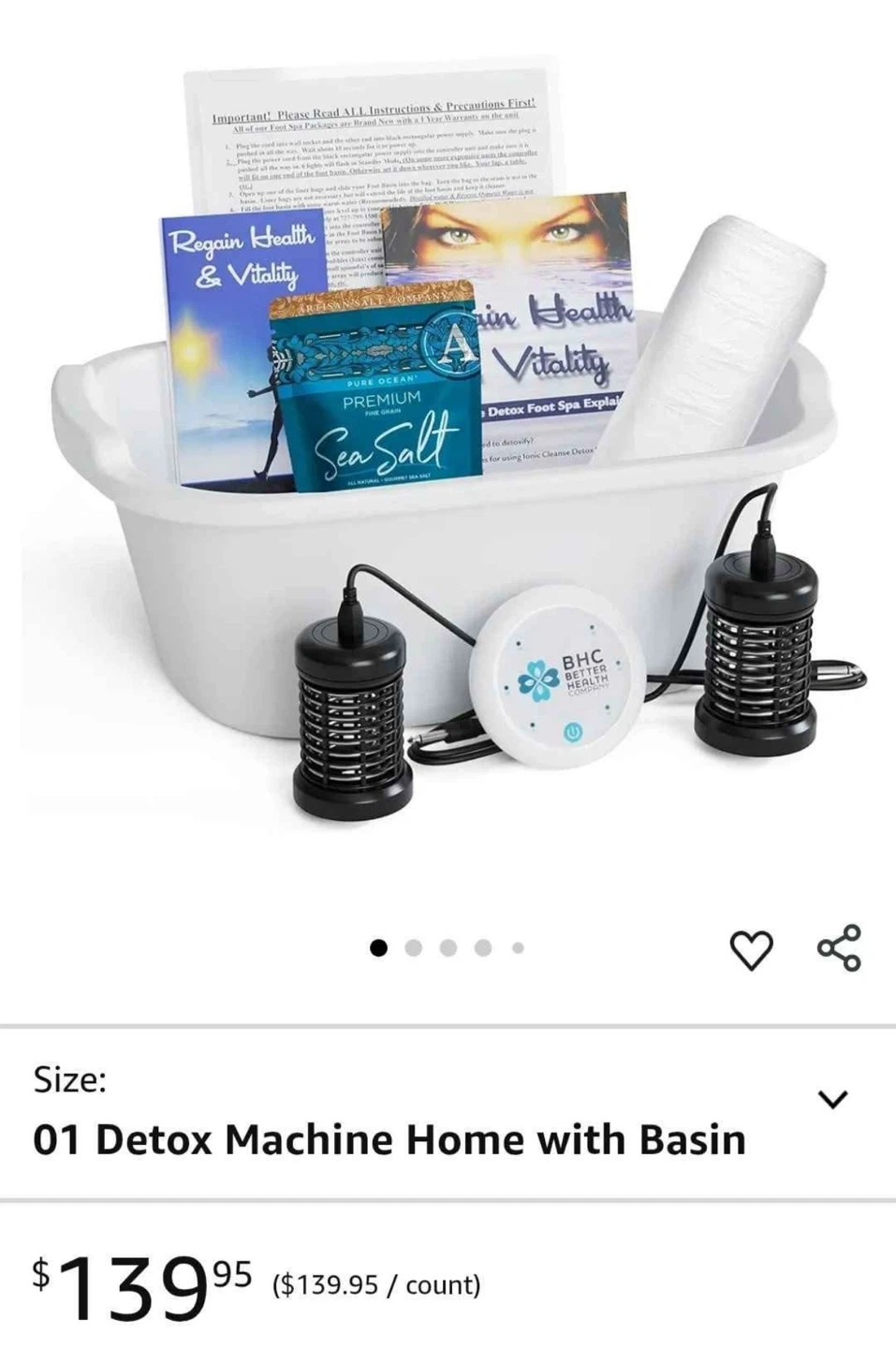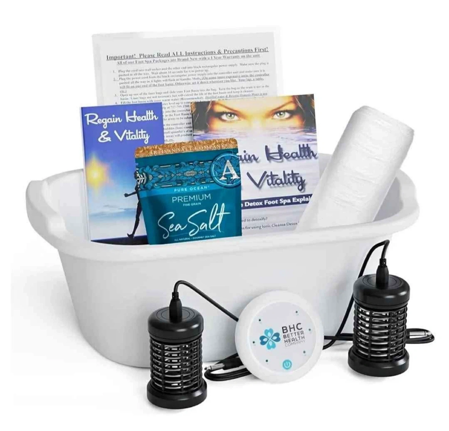 Ionic Foot Bath Detox Machine for Home Use - Free Regain Health & Vitality Booklet & Brochure - 2 Arrays, 20 Basin Liners, Detox Sea Salt, Basin 12QT BHC (Better Health Company) detox machine for home use, complete with a basin. It features a conductivity sensor that automatically shuts off if excess salt is detected. To reset the sensor, simply clean the array and use fresh water. Originally bought for $139.95