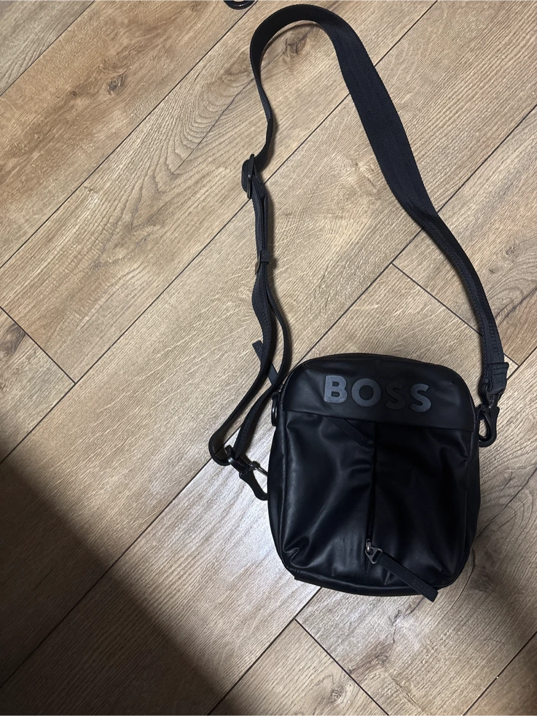 This is a black BOSS crossbody bag. It's made with a smooth material and features the BOSS logo across the front. Includes an adjustable strap.