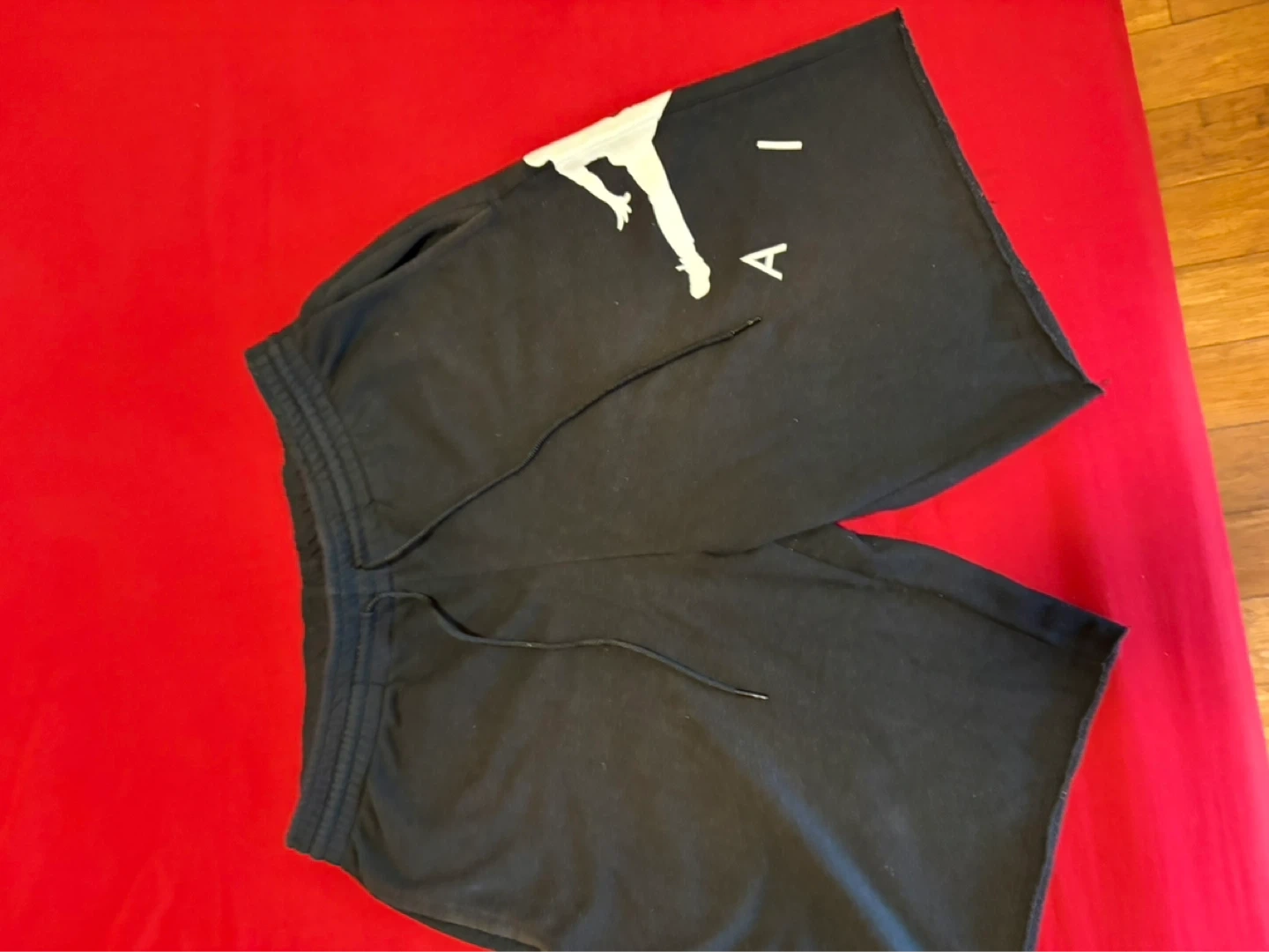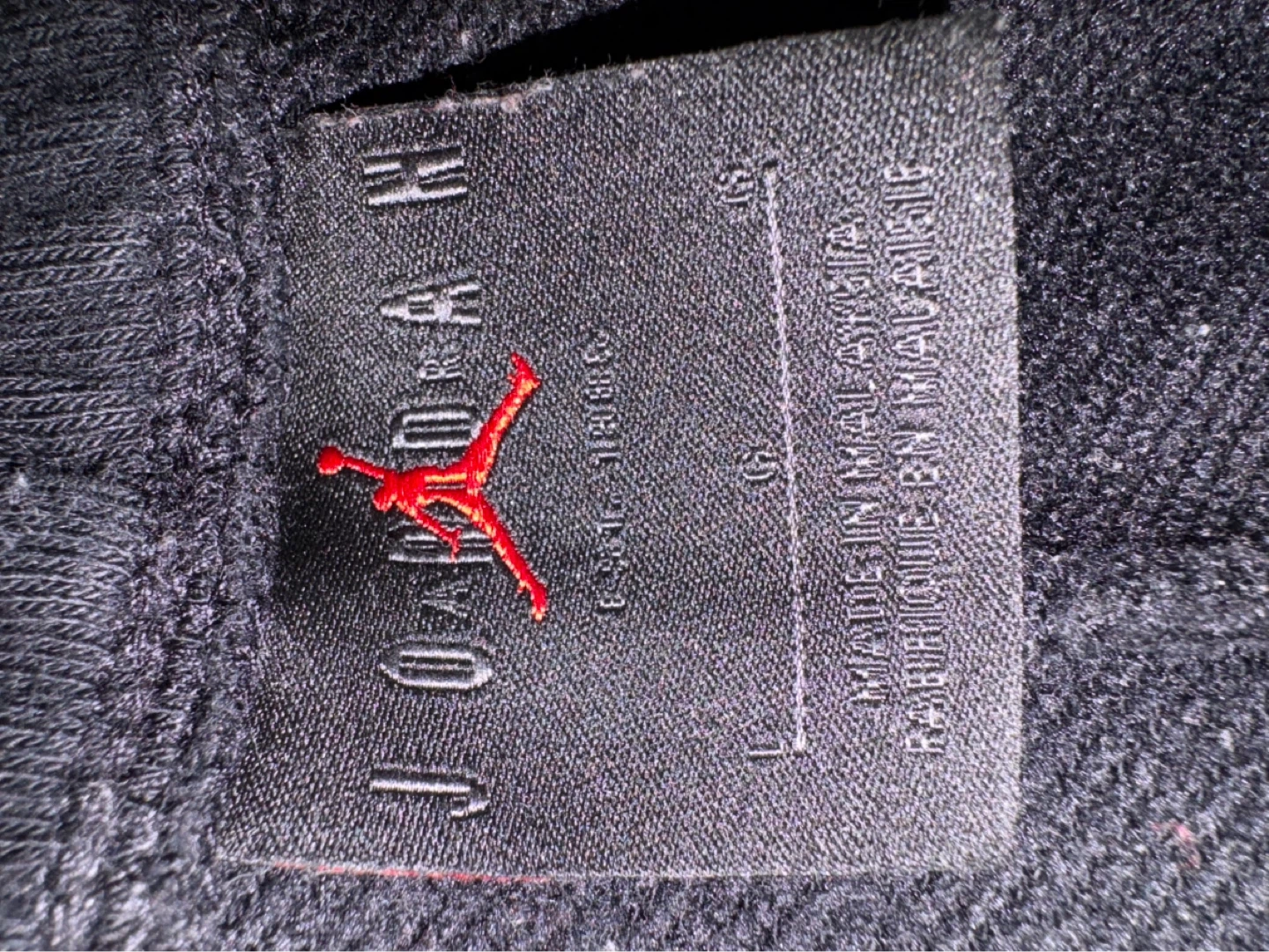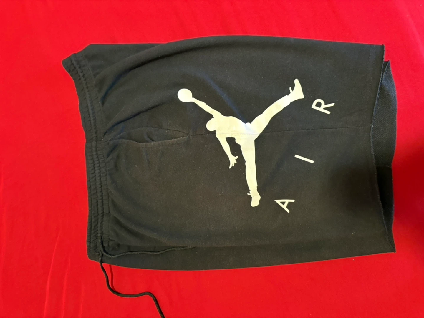 Jordan Brand basketball shorts in black. Features the iconic Jumpman logo and 'AIR' text. Made in Malaysia. Size L.