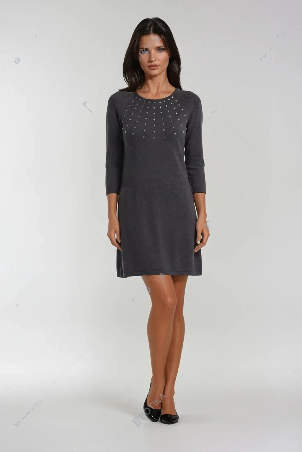 Selling a lovely grey knit dress! It features subtle embellishments around the neckline and has comfortable 3/4 sleeves. Perfect for a casual day out or dressed up for an evening event.
