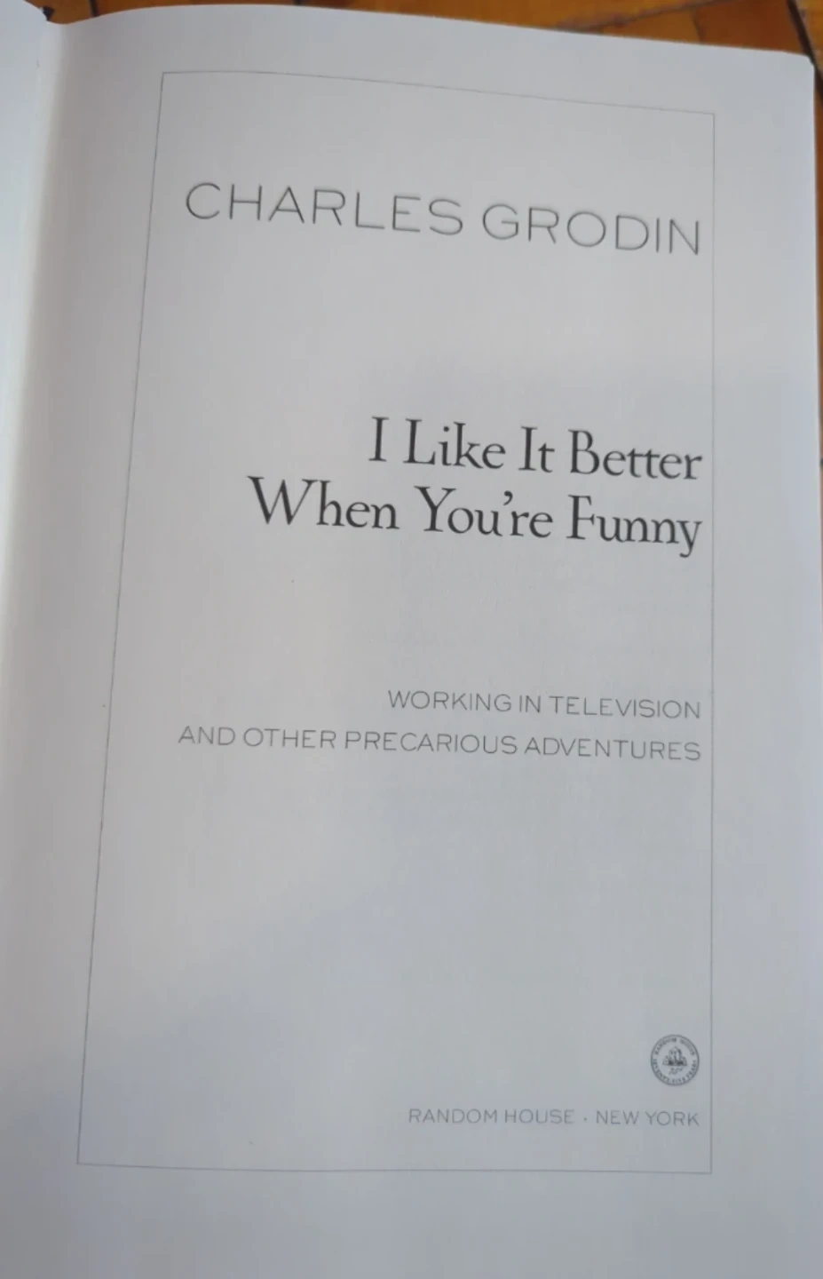 This is Charles Grodin's "I Like It Better When You're Funny" book. It contains "Working in Television and Other Precarious Adventures". Random House is the publisher.