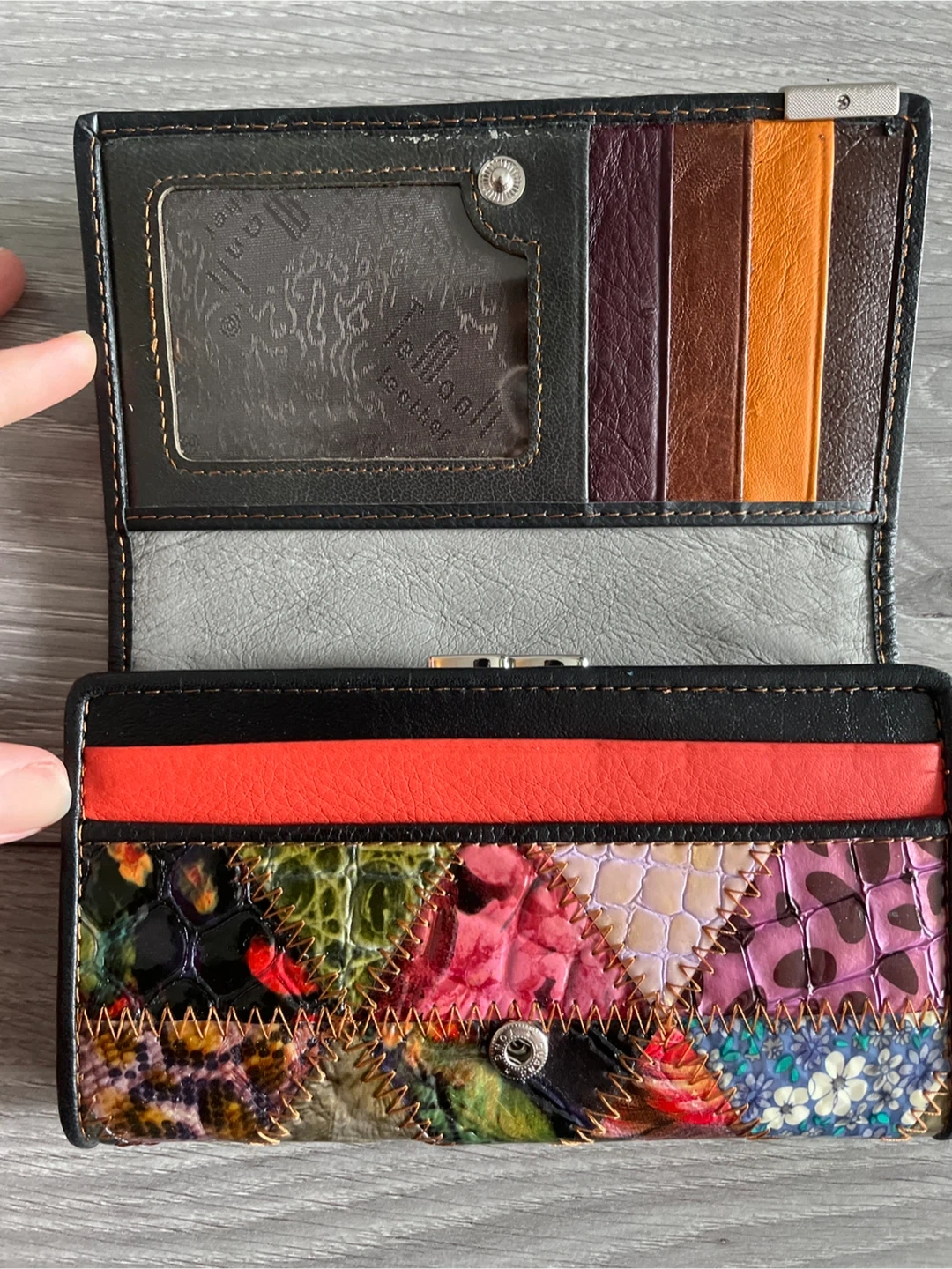 This Temanli wallet features a colourful patchwork design on the exterior. It has multiple card slots and a clear ID window inside. The interior is black leather with colourful card inserts.
