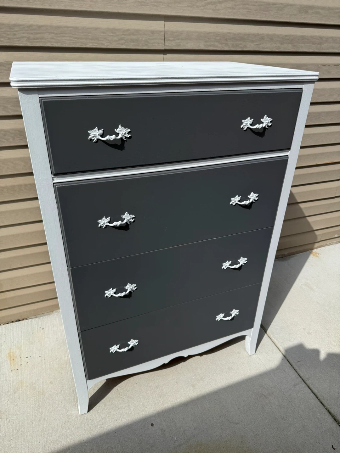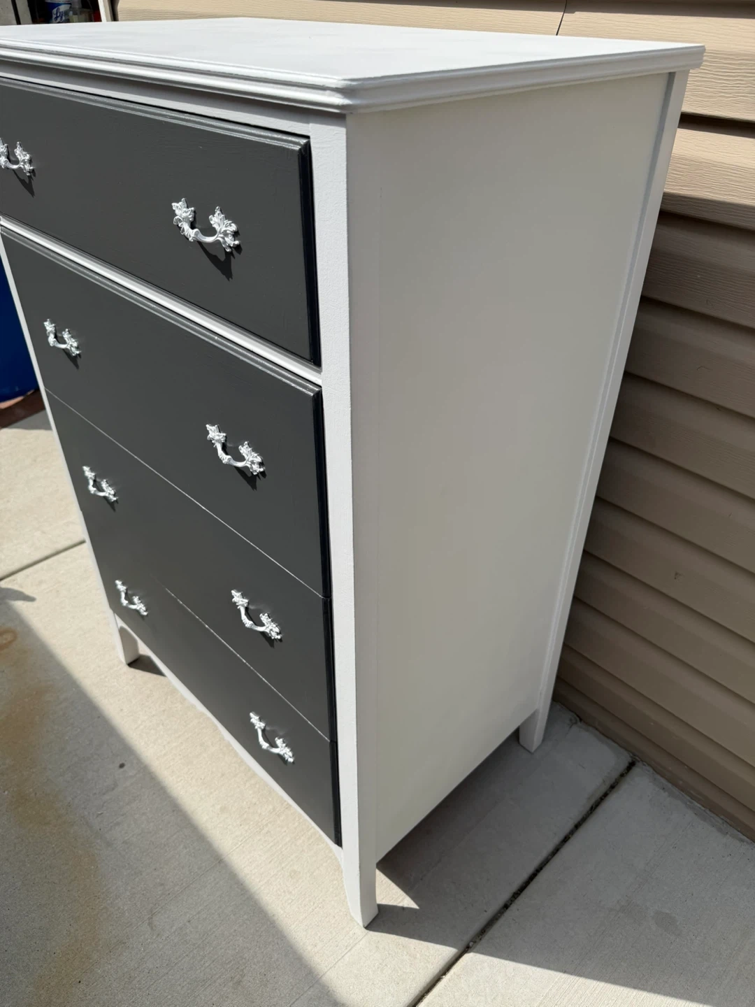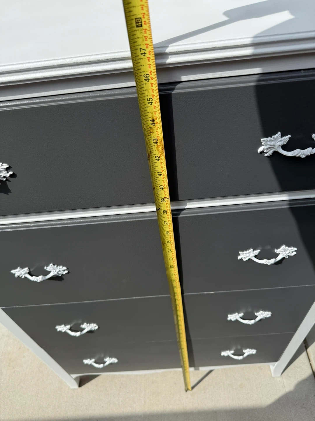 This is a 5-drawer dresser with a gray front and white sides. It's been refreshed with new paint and hardware. The dresser measures approximately 44 inches tall.