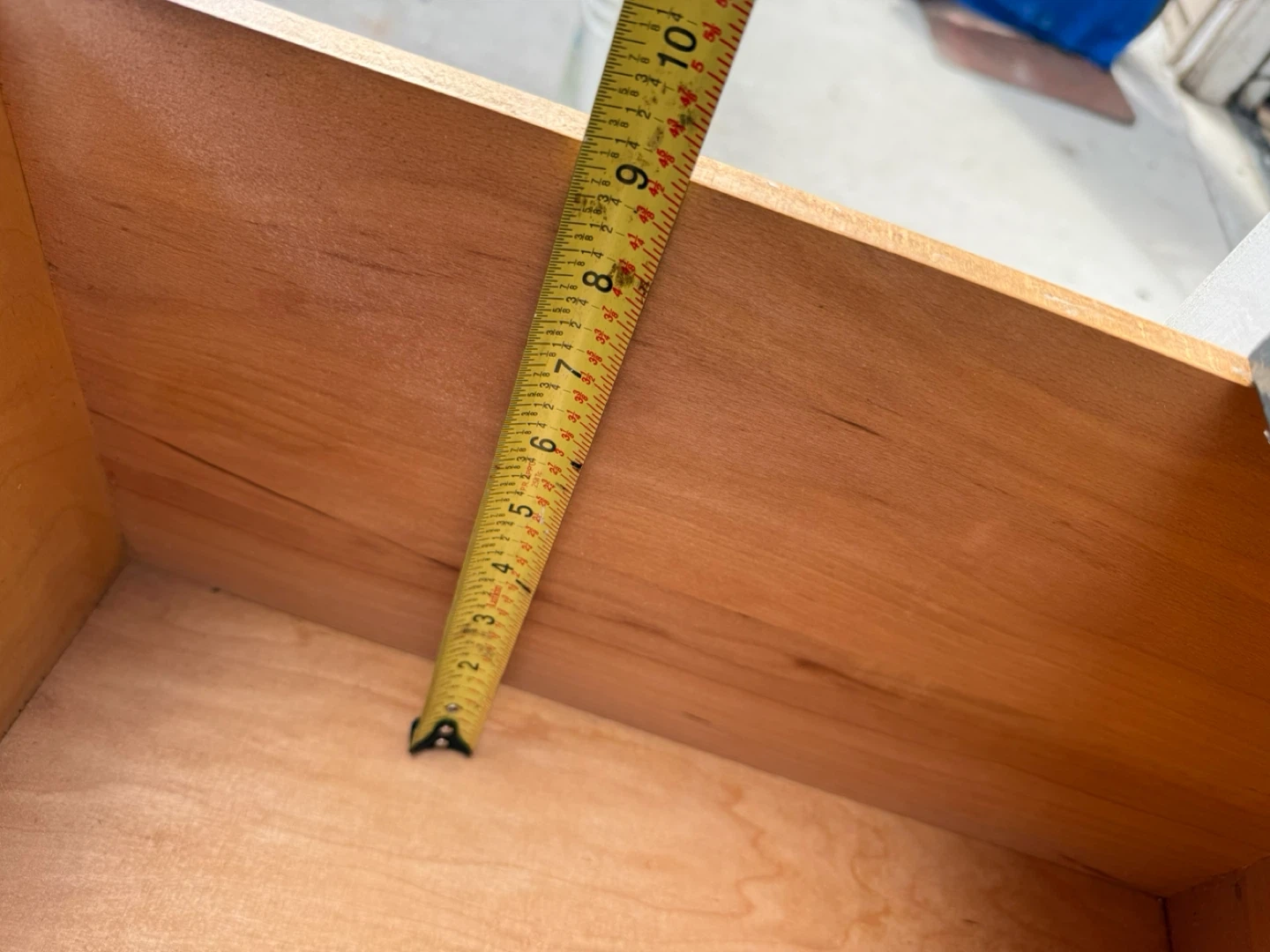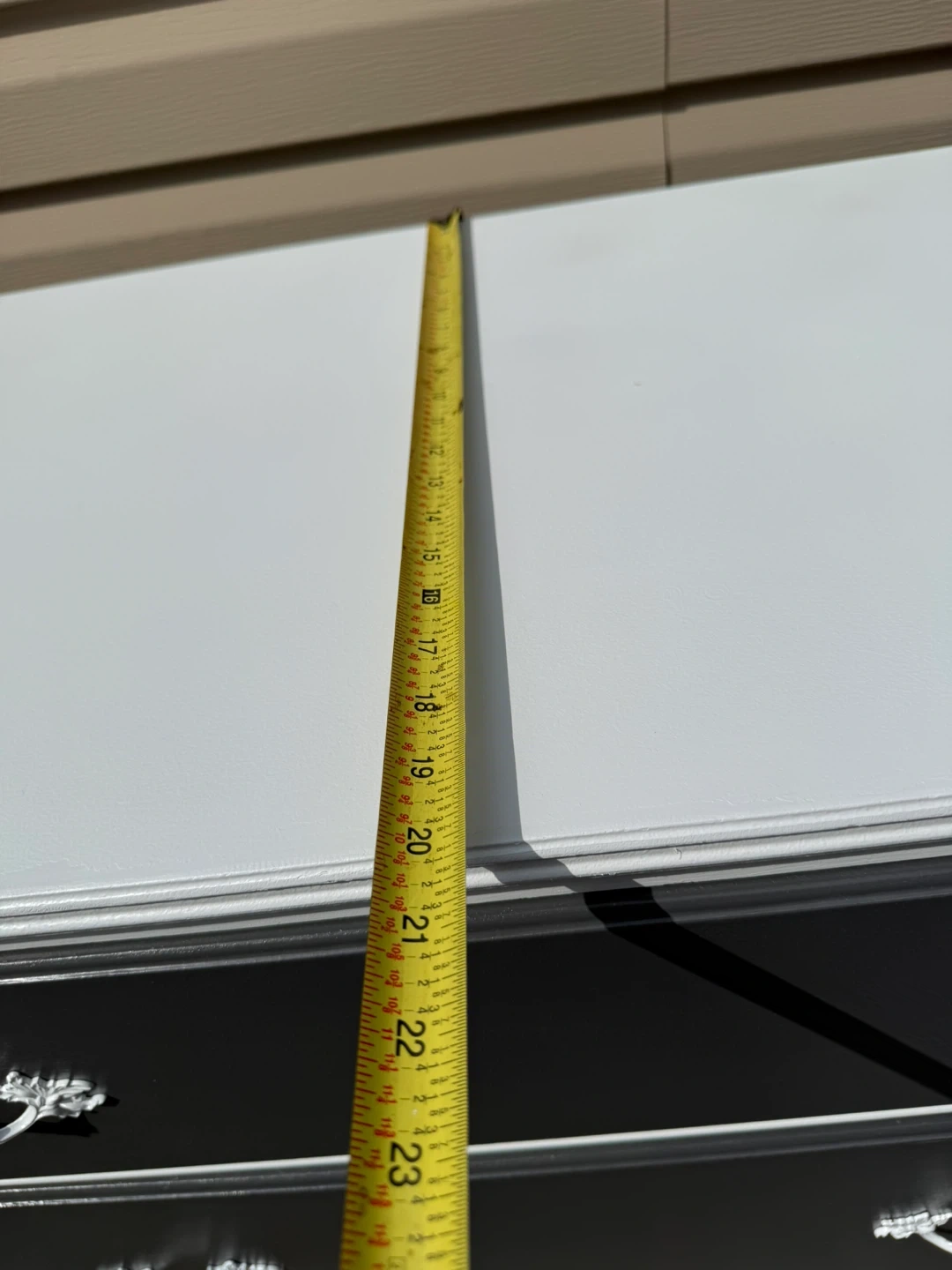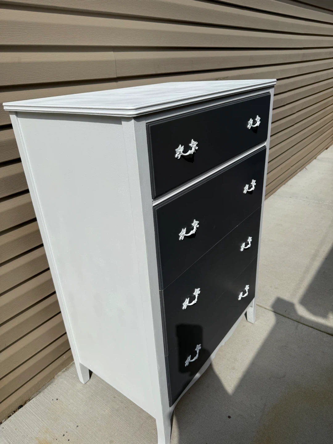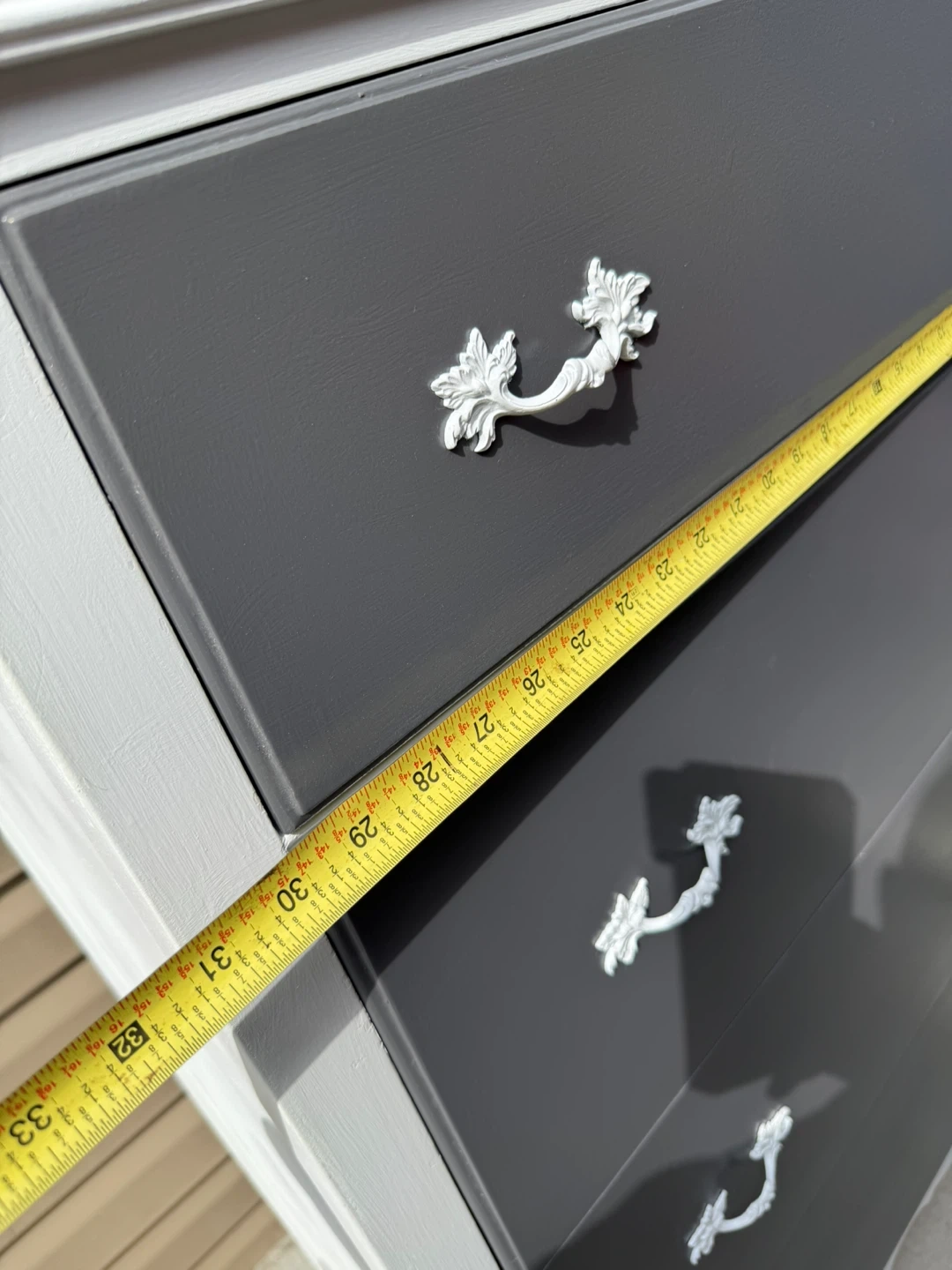This is a 5-drawer dresser with a gray front and white sides. It's been refreshed with new paint and hardware. The dresser measures approximately 44 inches tall.